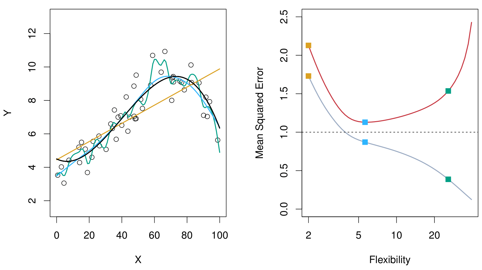 \text{MSE}_{\hat{f}} = E\left[\left(\hat{f}(x_0) - f(x_0)\right)^2\right] = \left[\text{Bias}\left(\hat{f}(x_0) \right)\right]^2 + \text{Var}\left(\hat{f}(x_0)\right)