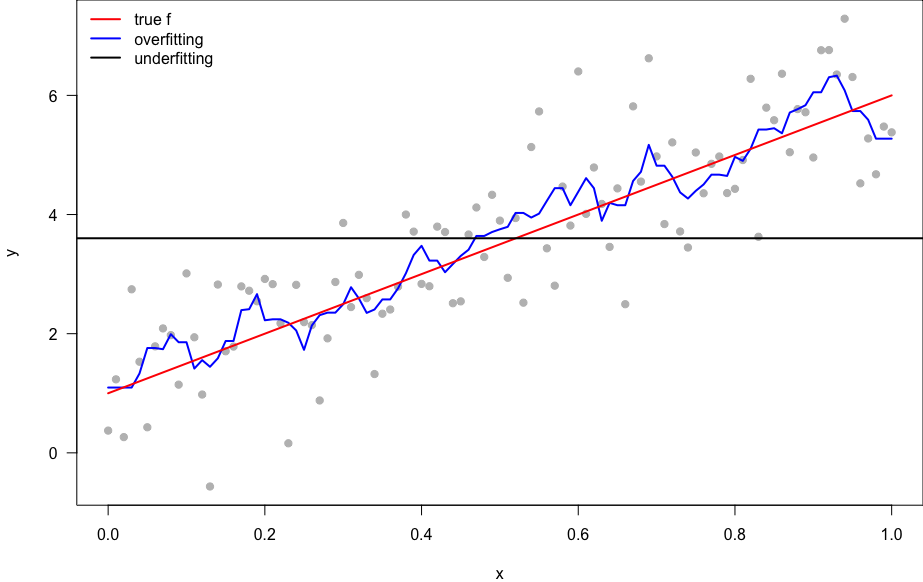Underfitting: A model that is too simple to capture complex patterns or shapes of the true f(x). The estimate \hat{f}(x) is rigid and far away from data.