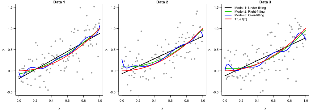 Model 3: Over-fitting y = \beta_0+\beta_1x+ \beta_2x^2 + \cdots + \beta_9x^9 + \epsilon