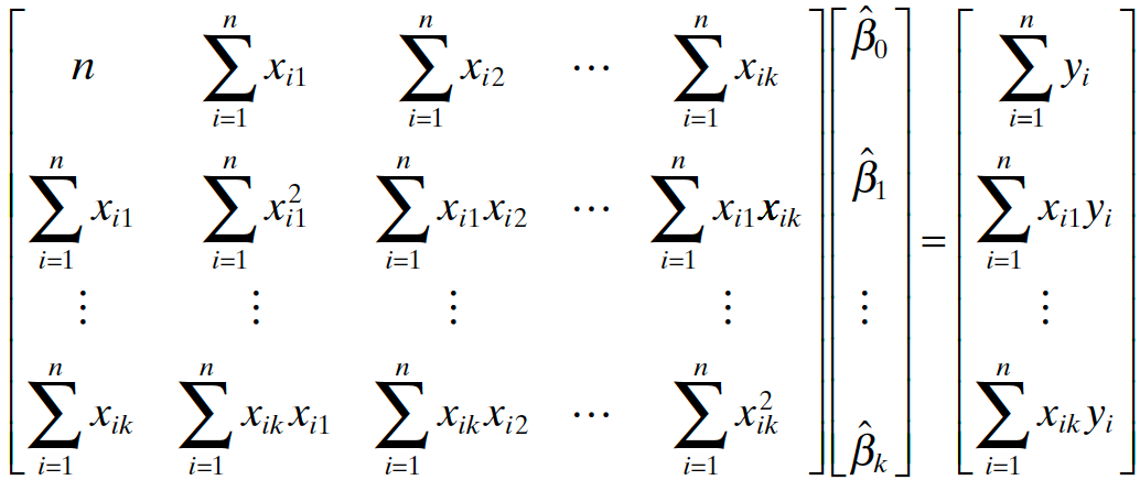 \[\begin{align*} \left.\frac{\partial SS_{res}}{\partial\alpha_0}\right\vert_{b_0, b_1, \dots, b_k} &= -2 \sum_{i=1}^n\left(y_i - \alpha_0 - \sum_{j=1}^k \alpha_j x_{ij}\right) = 0\\ \left.\frac{\partial SS_{res}}{\partial\alpha_j}\right\vert_{b_0, b_1, \dots, b_k} &= -2 \sum_{i=1}^n\left(y_i - \alpha_0 - \sum_{j=1}^k \alpha_j x_{ij}\right)x_{ij} = 0, \quad j = 1, 2, \dots, k \end{align*}\]