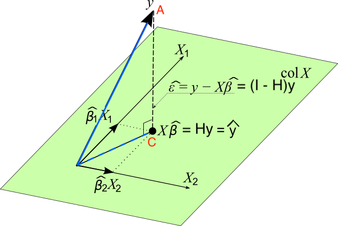 \(\small {\bf e} = ({\bf y - \hat{\bf y}}) = ({\bf y - X b}) = ({\bf I} - {\bf H}) {\bf y} \perp Col({\bf X})\)
