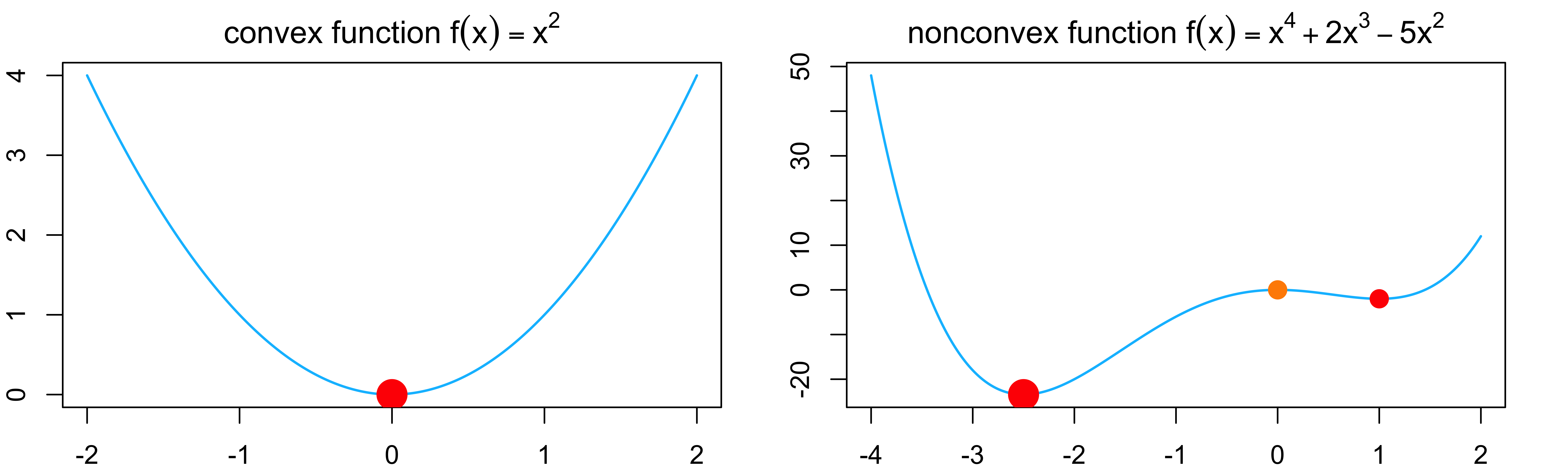 \[\begin{align} \text{Left:} \qquad \nabla^2 f_1(x) &= 2 \\ \text{Right:} \qquad \nabla^2 f_2(x) &= 12x^2 + 12 x - 10\\ \end{align}\]