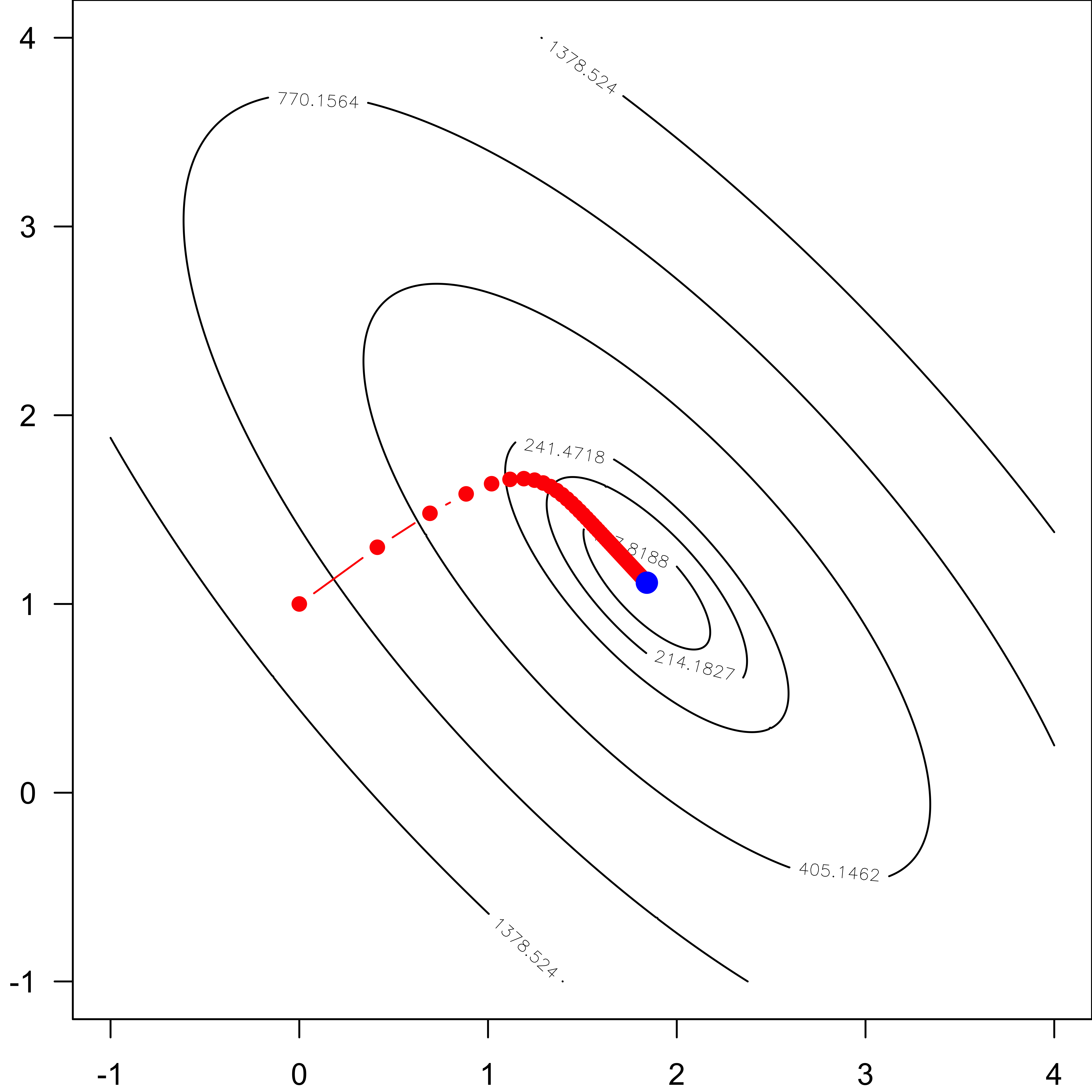 points(b[1], b[2], pch = 19, col = "blue", cex = 2)\[ \begin{align} \frac{\partial \ell(\boldsymbol \beta)}{\partial \boldsymbol \beta} = -\frac{1}{n} \sum_{i=1}^n (y_i - x_i' \boldsymbol \beta) x_i. \end{align} \] First set an initial beta value, say \(\boldsymbol \beta = \mathbf{0}\) for all entries, then proceed with the update