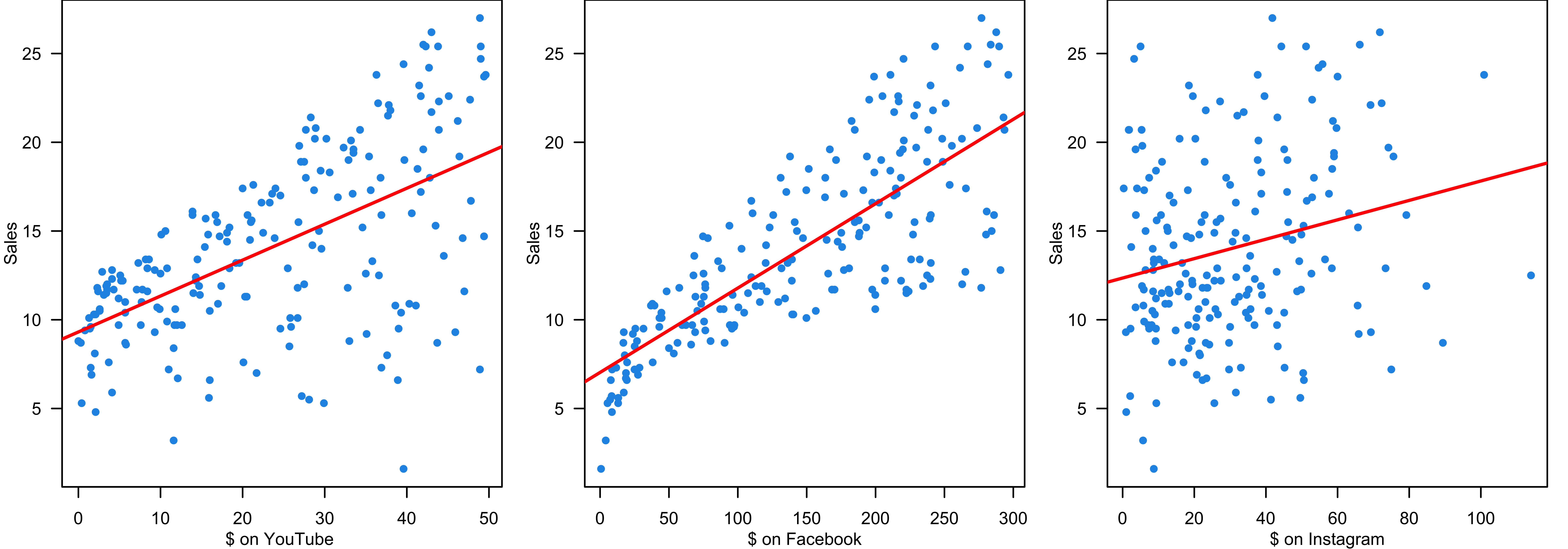 sales \((Y)\) and amount of money spent on advertising on YouTube (YT) \((X_1)\), Facebook (FB) \((X_2)\), Instagram (IG) \((X_3)\).1