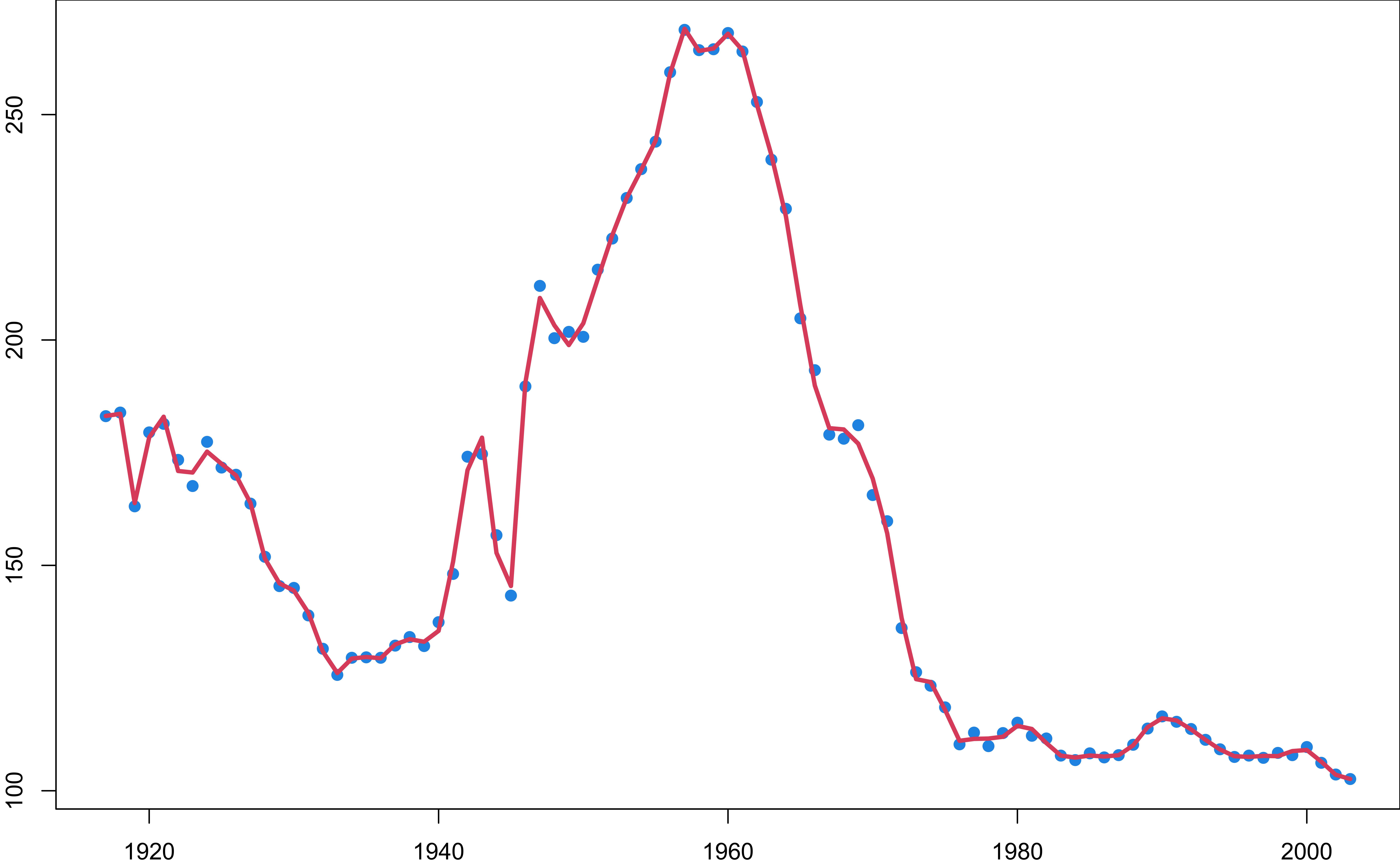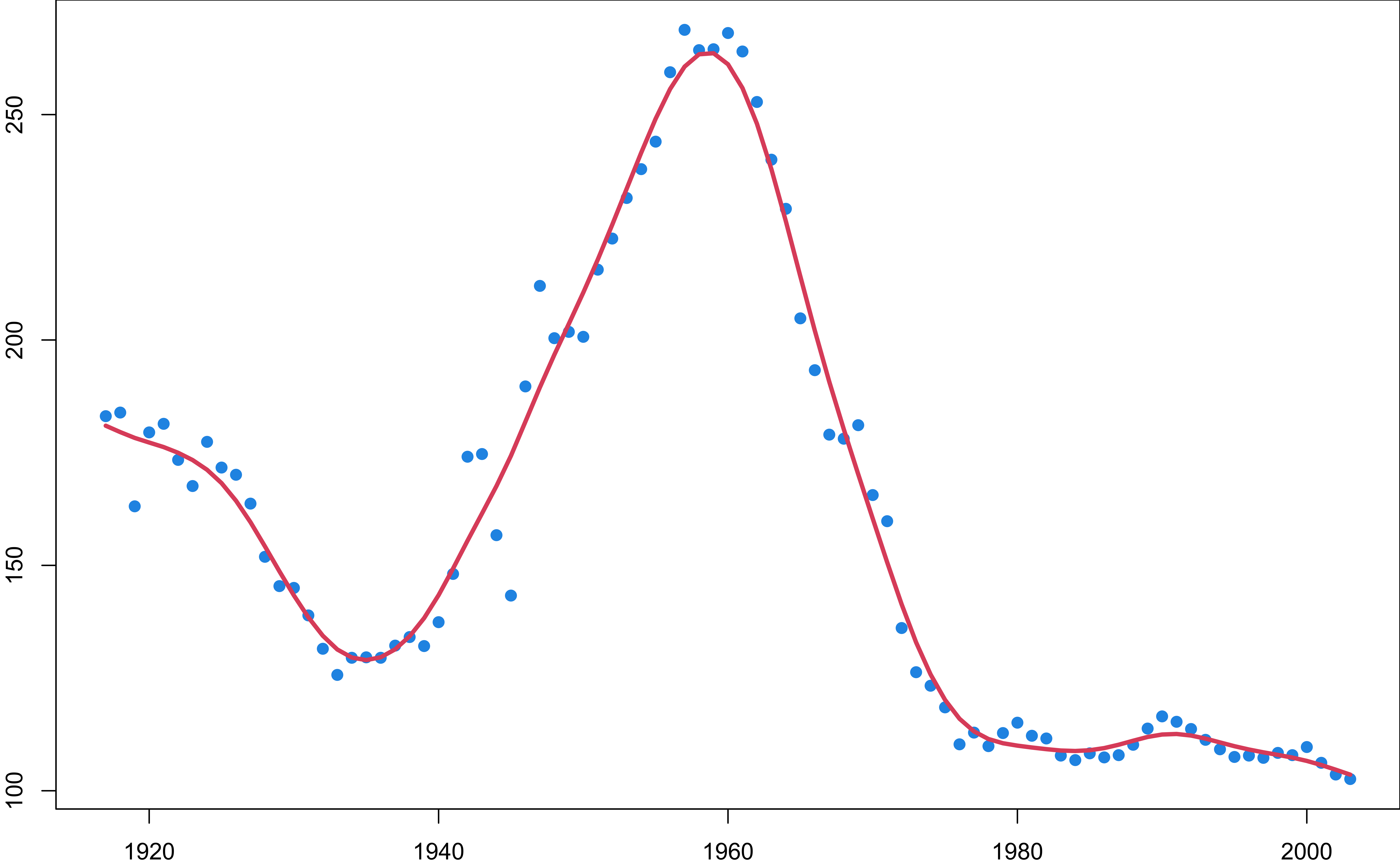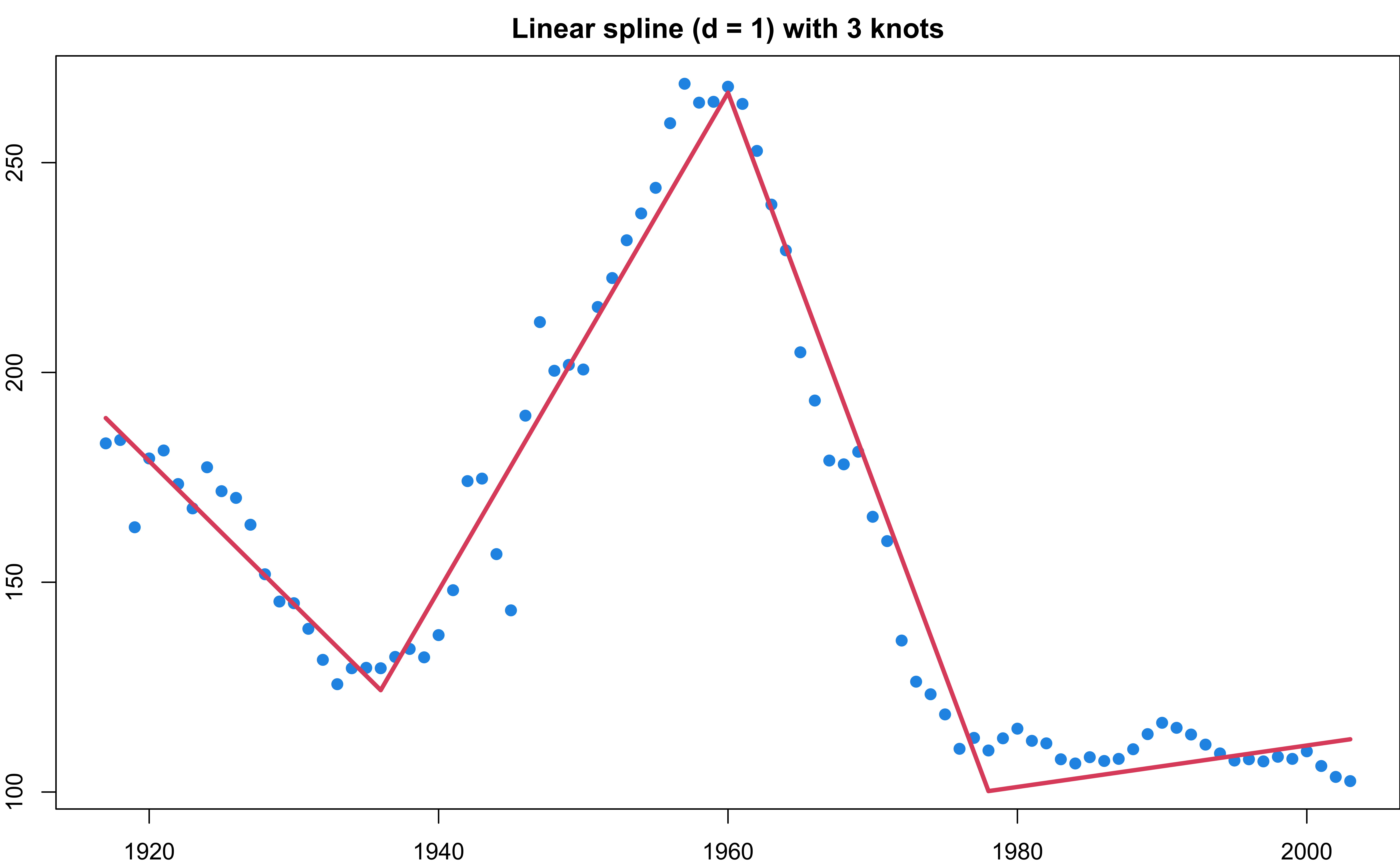 \[y=\begin{cases} \beta_{01} + \beta_{11}x+ \epsilon & \text{if } x < 1936\\ \beta_{02} + \beta_{12}x+\epsilon & \text{if } 1936 \le x < 1960 \\ \beta_{03} + \beta_{13}x+\epsilon & \text{if } 1960 \le x < 1978 \\ \beta_{04} + \beta_{14}x+\epsilon & \text{if } 1978 \le x \end{cases}\]