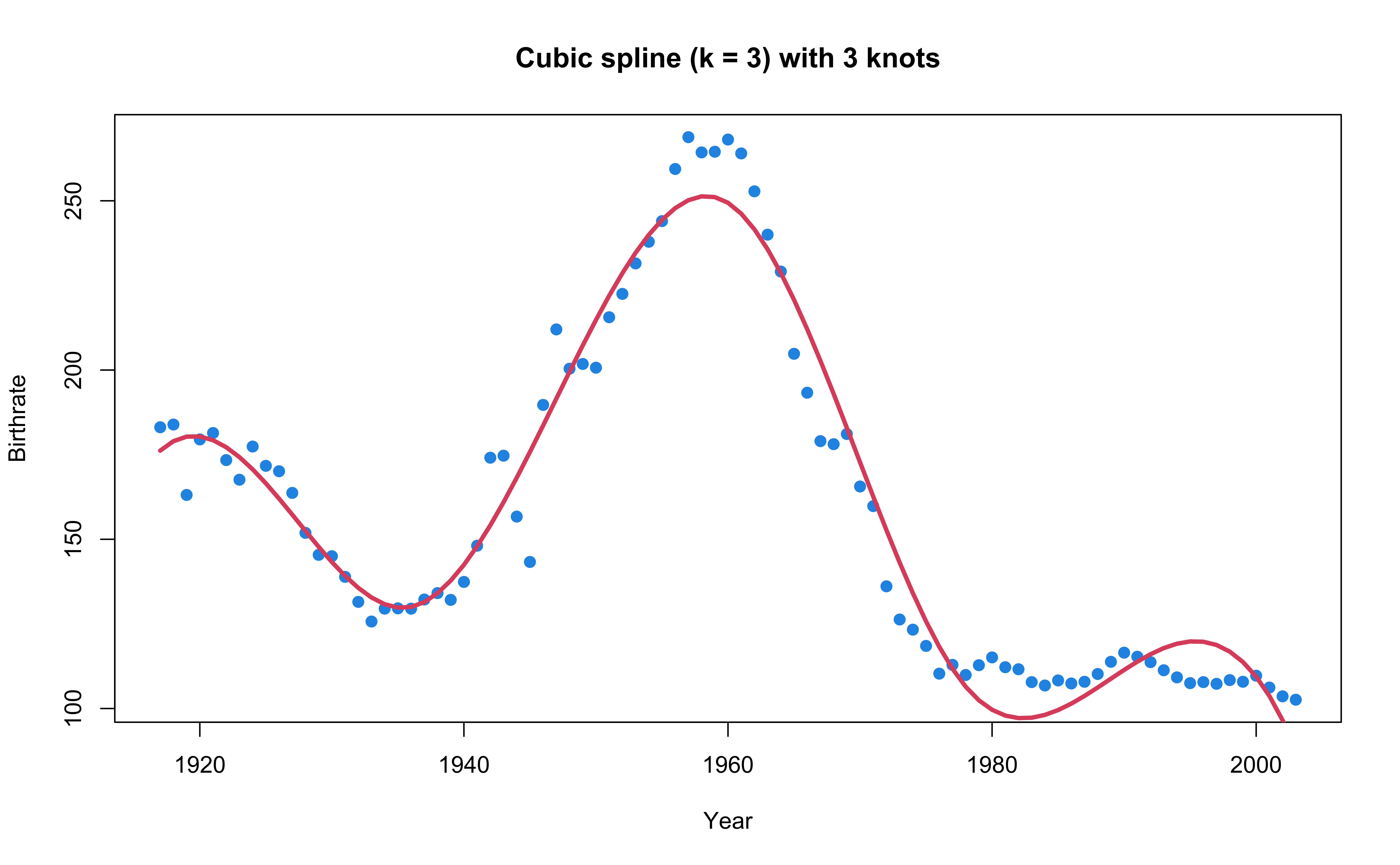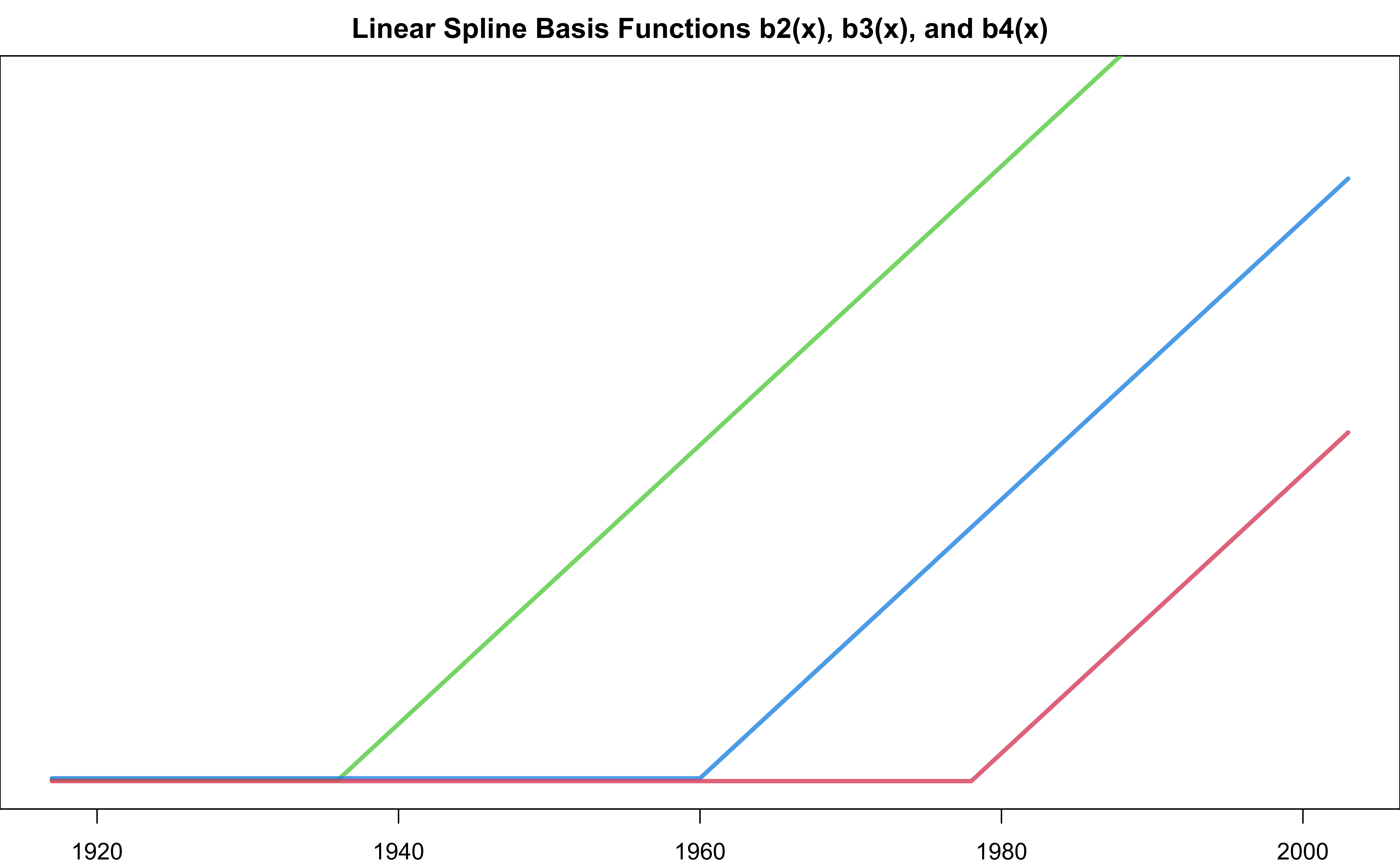 \[\begin{align} y &= \beta_0 + \beta_1 b_1(x) + \beta_2 b_2(x) + \beta_3 b_3(x) + \beta_4 b_4(x) + \epsilon\\ &=\beta_0 + \beta_1 x + \beta_2 (x - \xi_1)_+ + \beta_3 (x - \xi_2)_+ + \beta_4 (x - \xi_3)_+ + \epsilon \end{align}\]