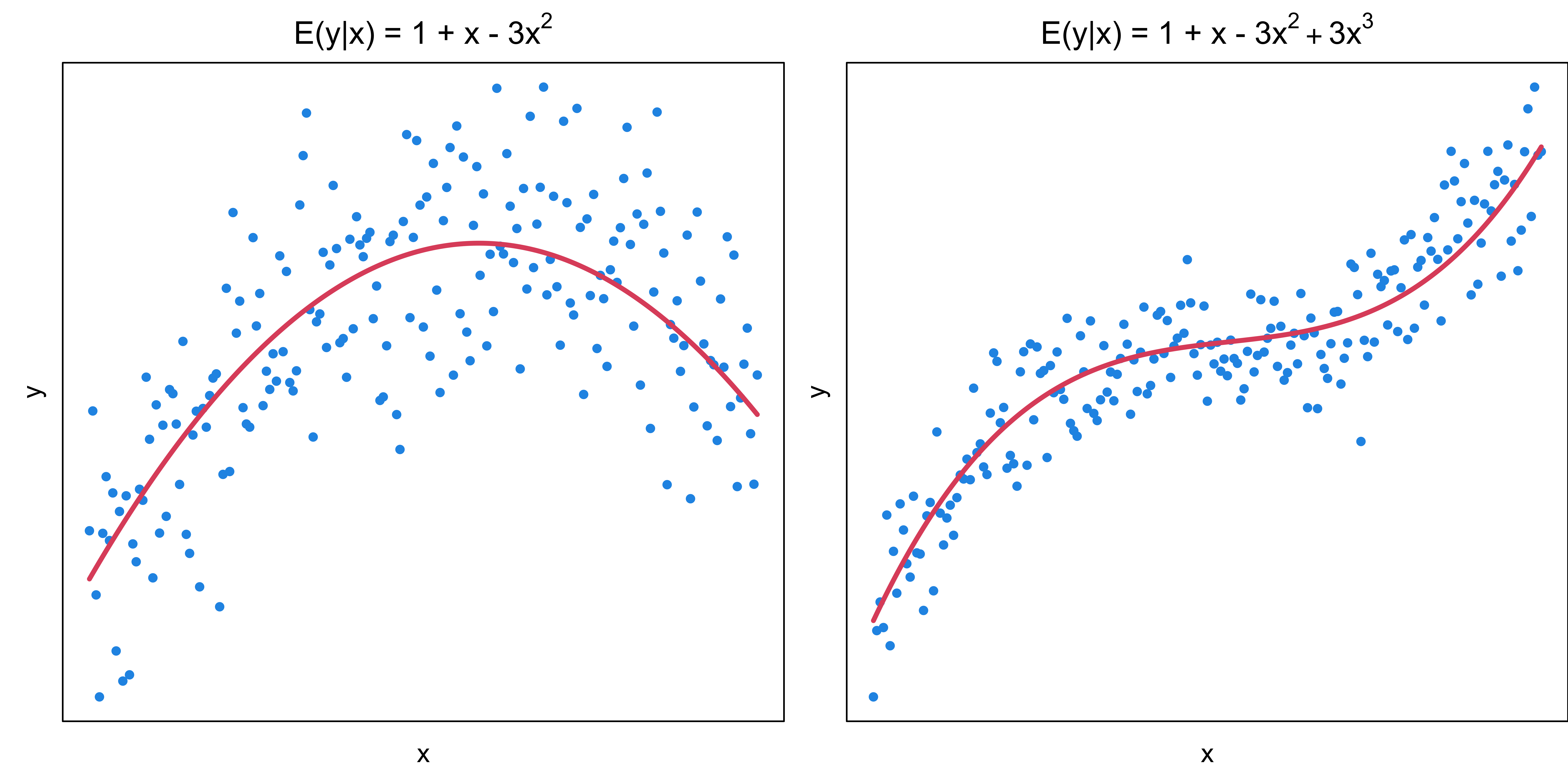 Feature engineering: When \(y\) and \(x\) are not linearly associated, we transform \(x\) (sometimes also \(y\)) so that \(y\) and the transformed \(x\) become linearly related.