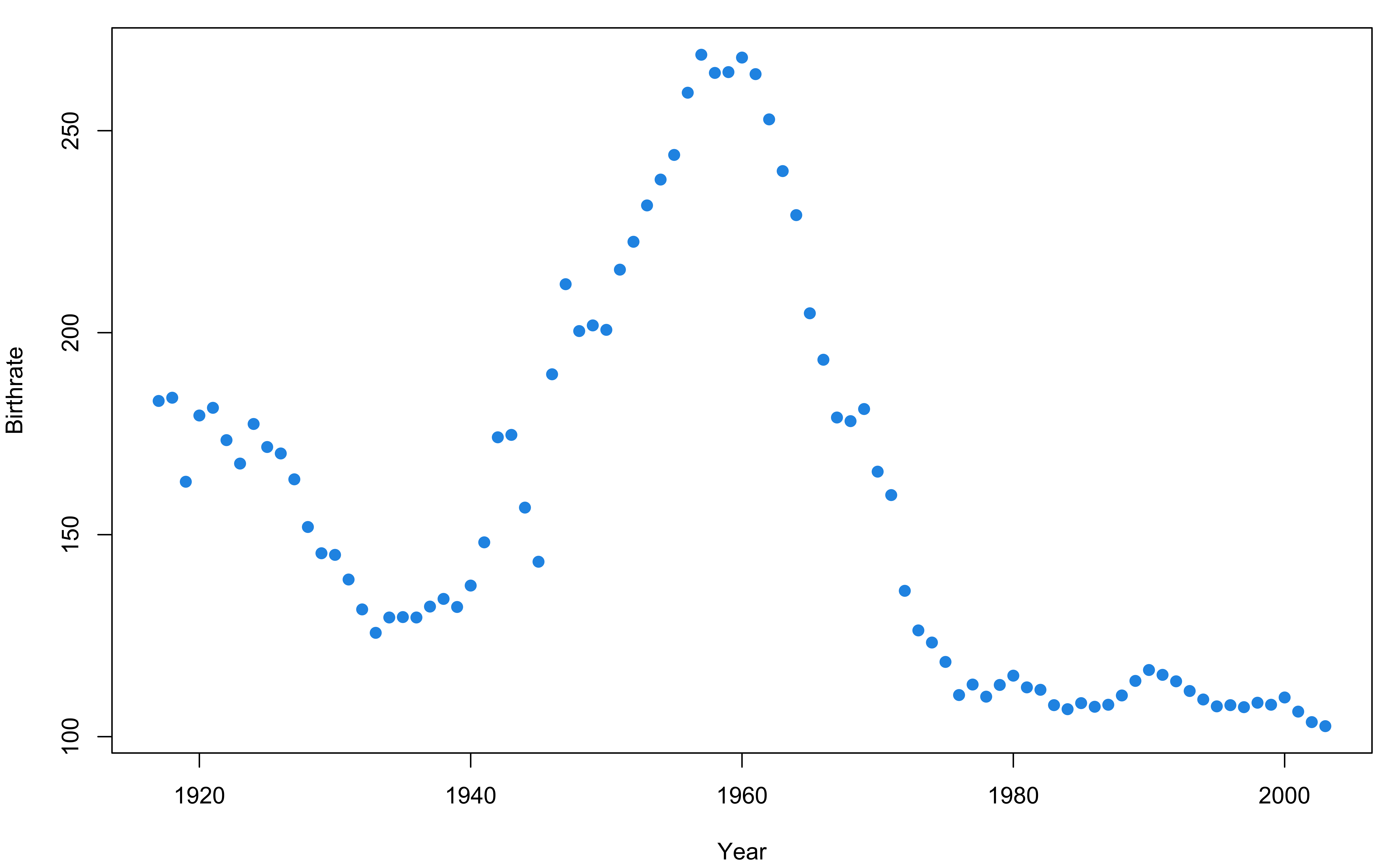 \[y=\begin{cases} \beta_{01} + \beta_{11}x+ \epsilon & \quad \text{if } x < 1936\\ \beta_{02} + \beta_{12}x+\epsilon & \quad \text{if } 1936 \le x < 1960 \\ \beta_{03} + \beta_{13}x+\epsilon & \quad \text{if } 1960 \le x < 1978 \\ \beta_{04} + \beta_{14}x+\epsilon & \quad \text{if } 1978 \le x \end{cases}\]