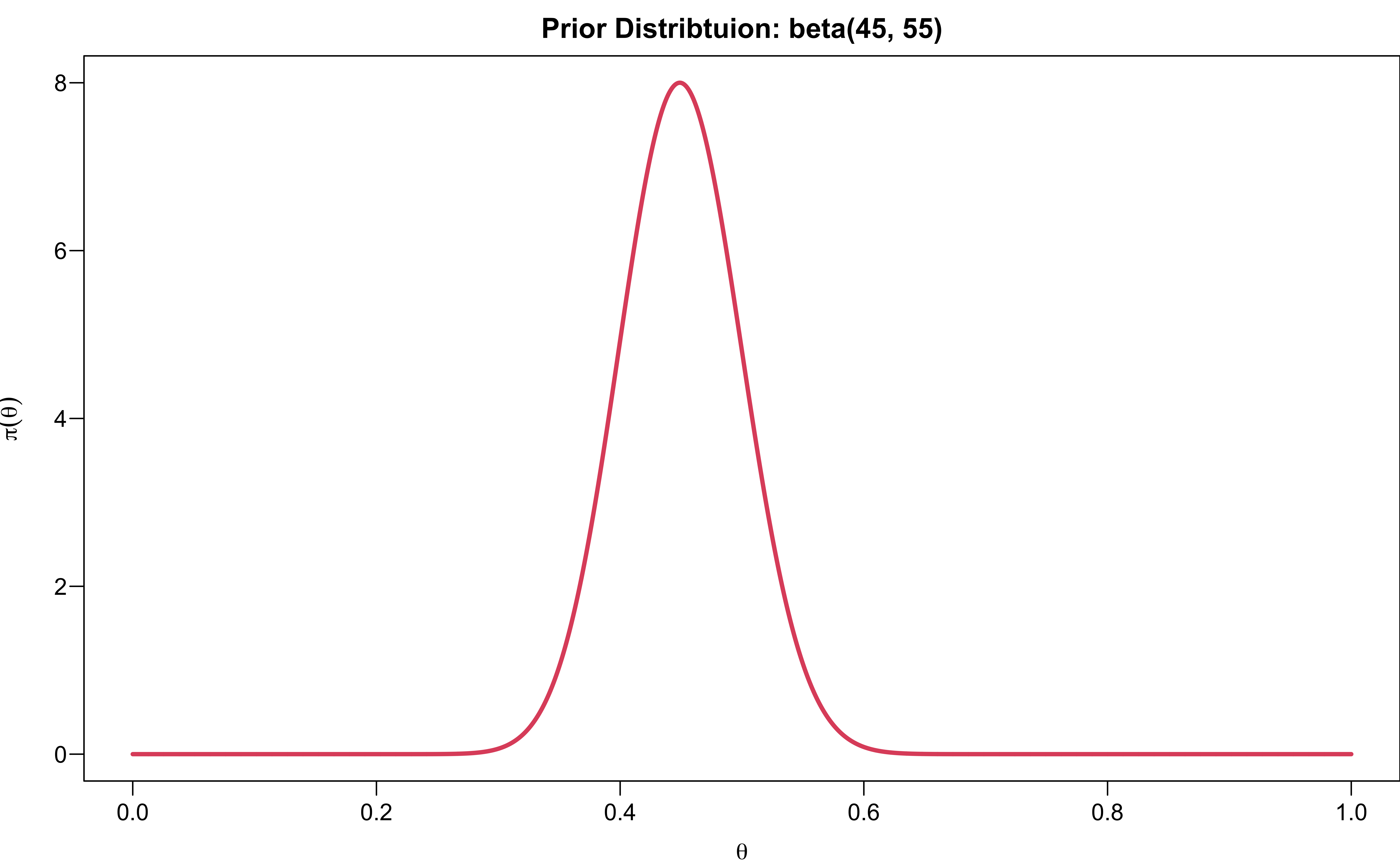 \[\begin{align}Y \mid \theta &\sim \text{binomial}(n=50, \theta)\\ \theta &\sim \text{beta}(45, 55) \end{align}\]