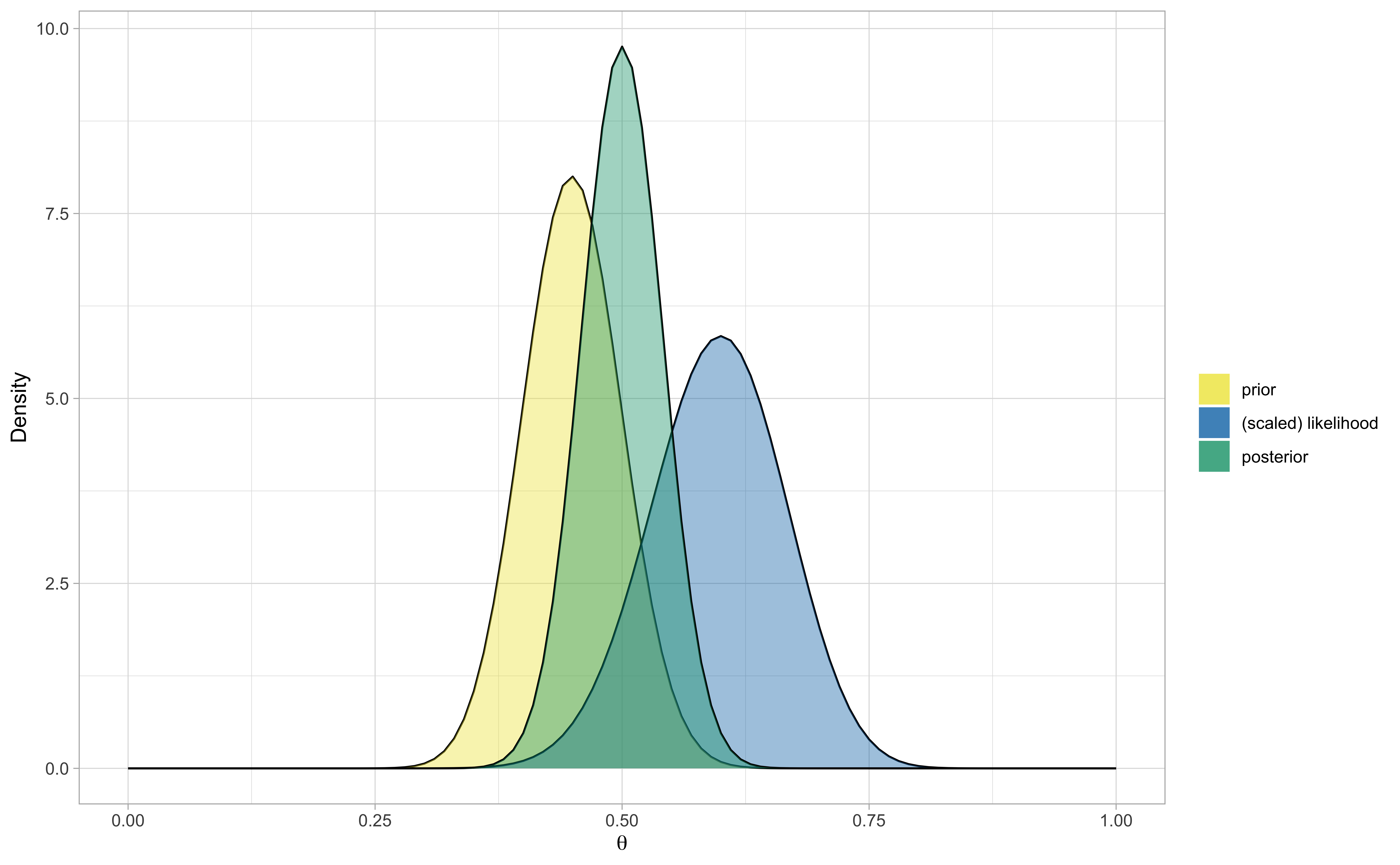 \[\text{posterior } \propto \text{ likelihood } \cdot \text{ prior } \]
