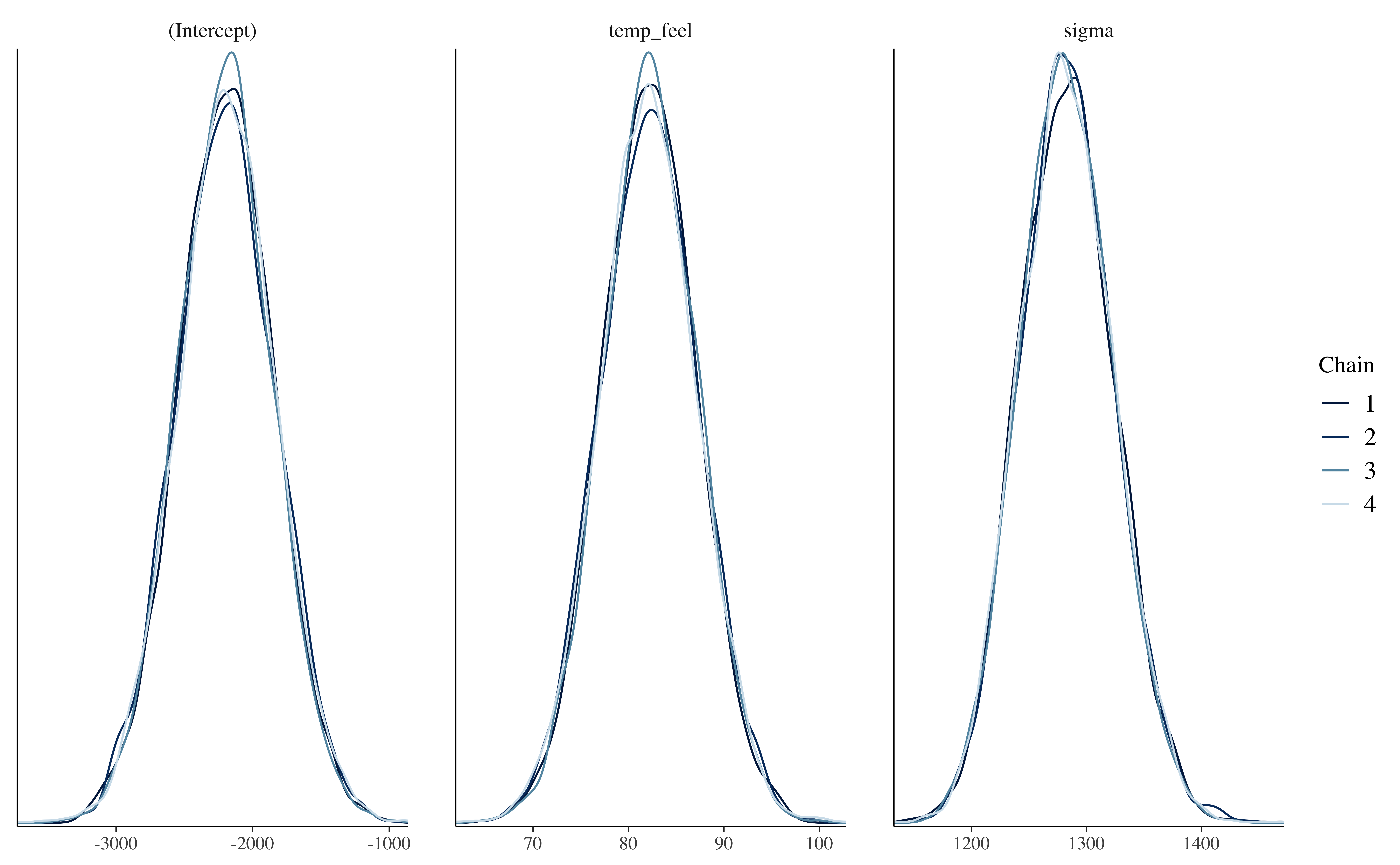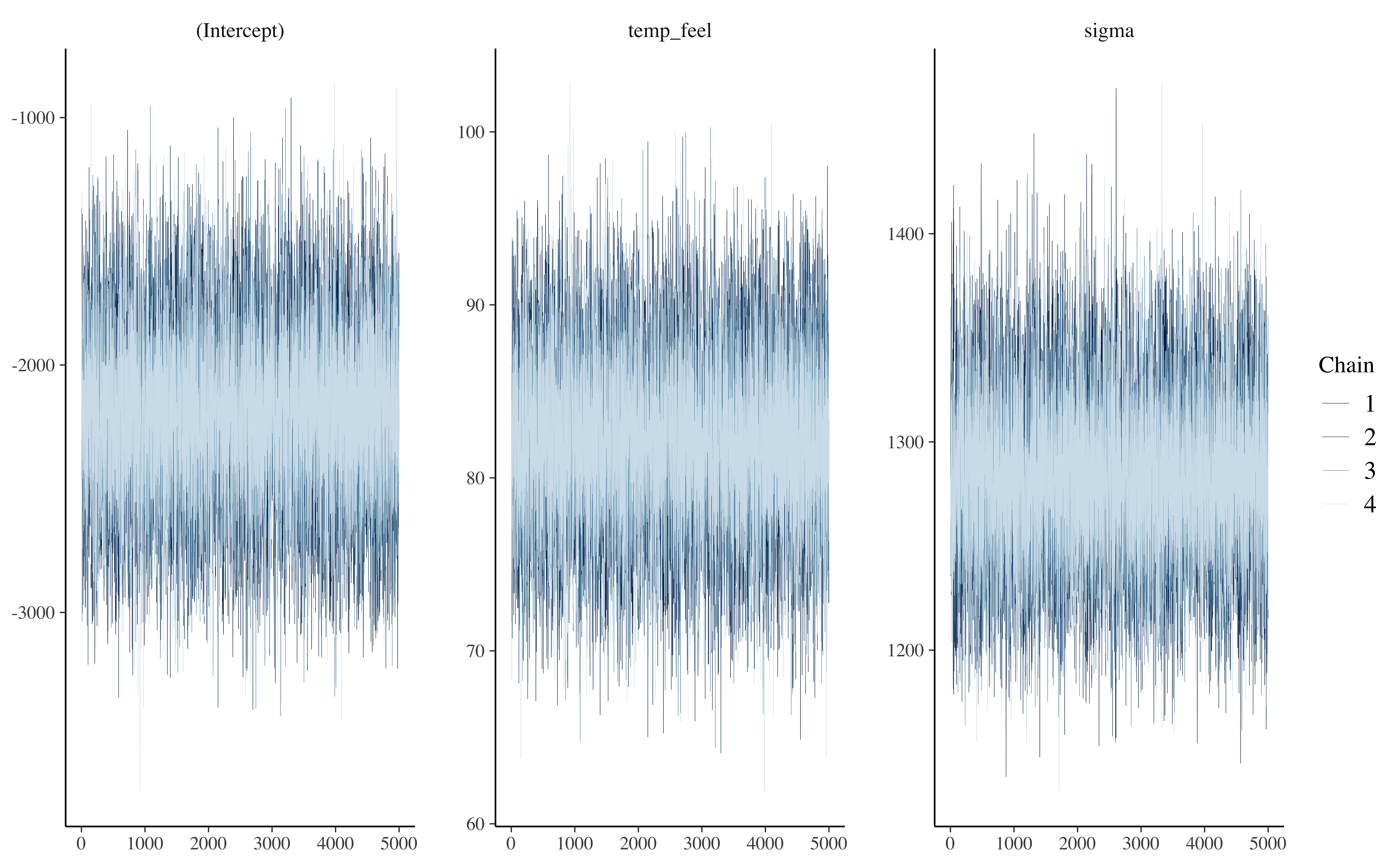 After tossing out the first half of Markov chain values from the warm-up or burn-in phase, stan_glm() simulation produces four parallel chains of length 5000 for each model parameter: