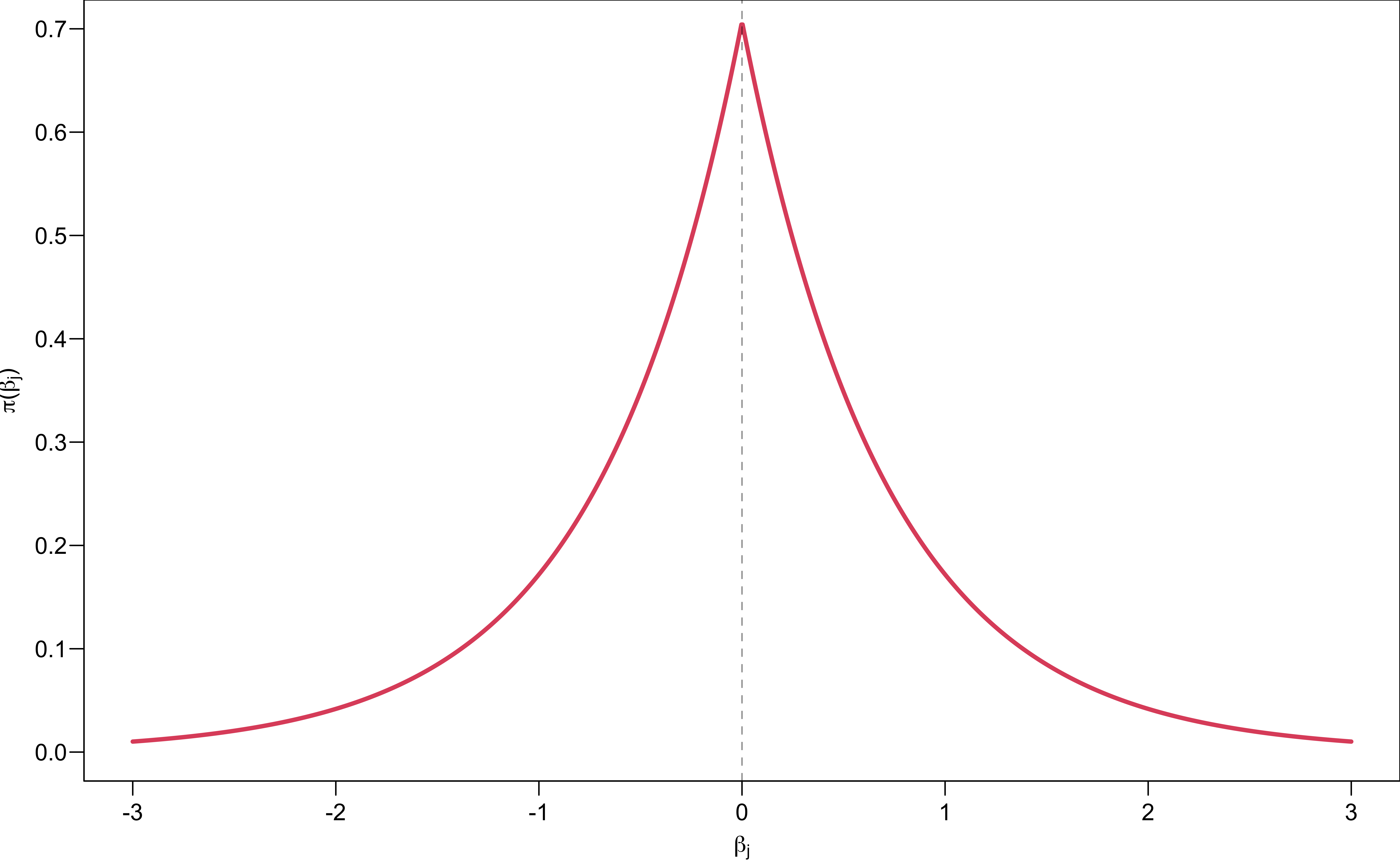 \[\beta_j \stackrel{iid}{\sim} \text{Laplace}\left(0, \tau(\lambda)\right)\]