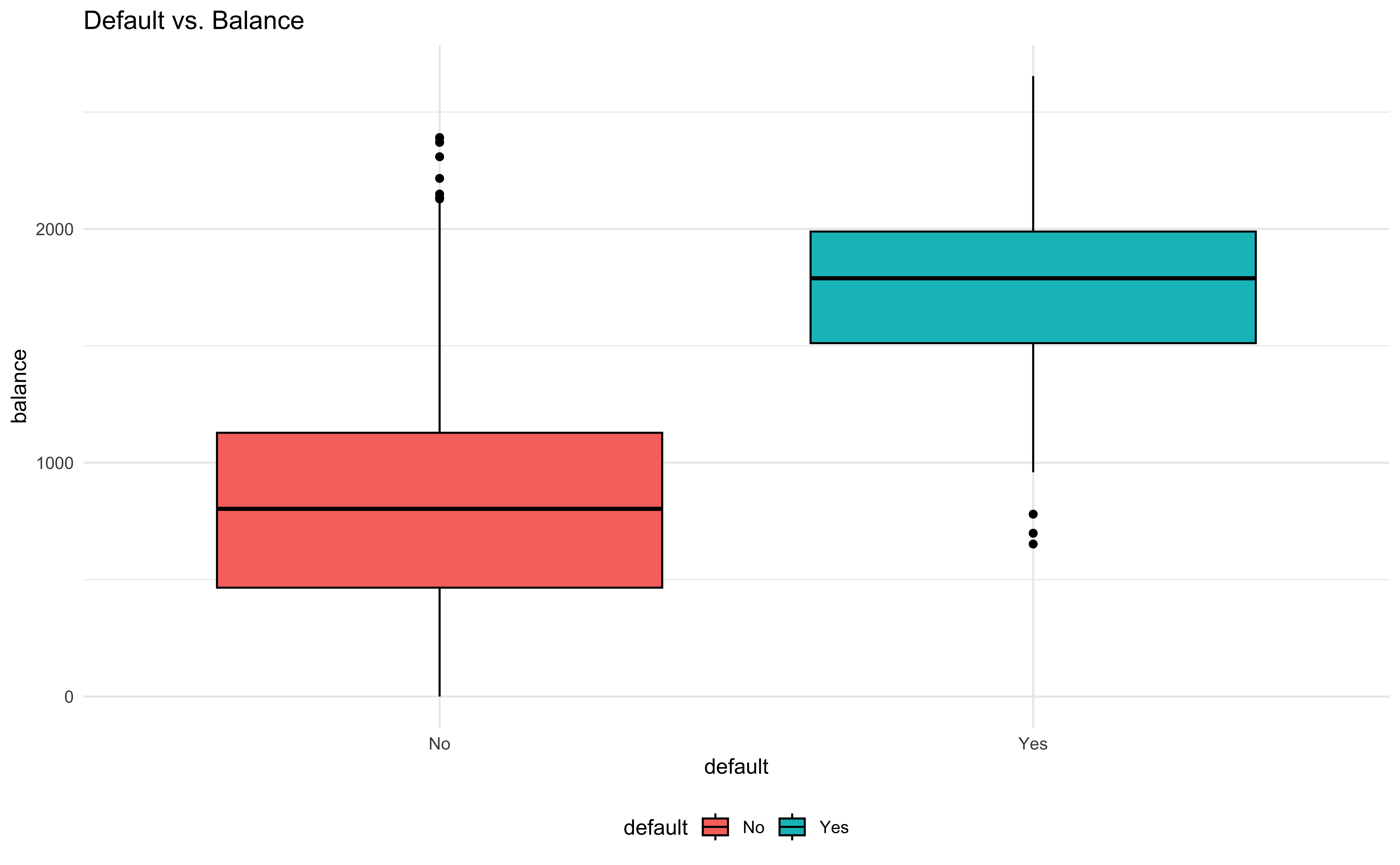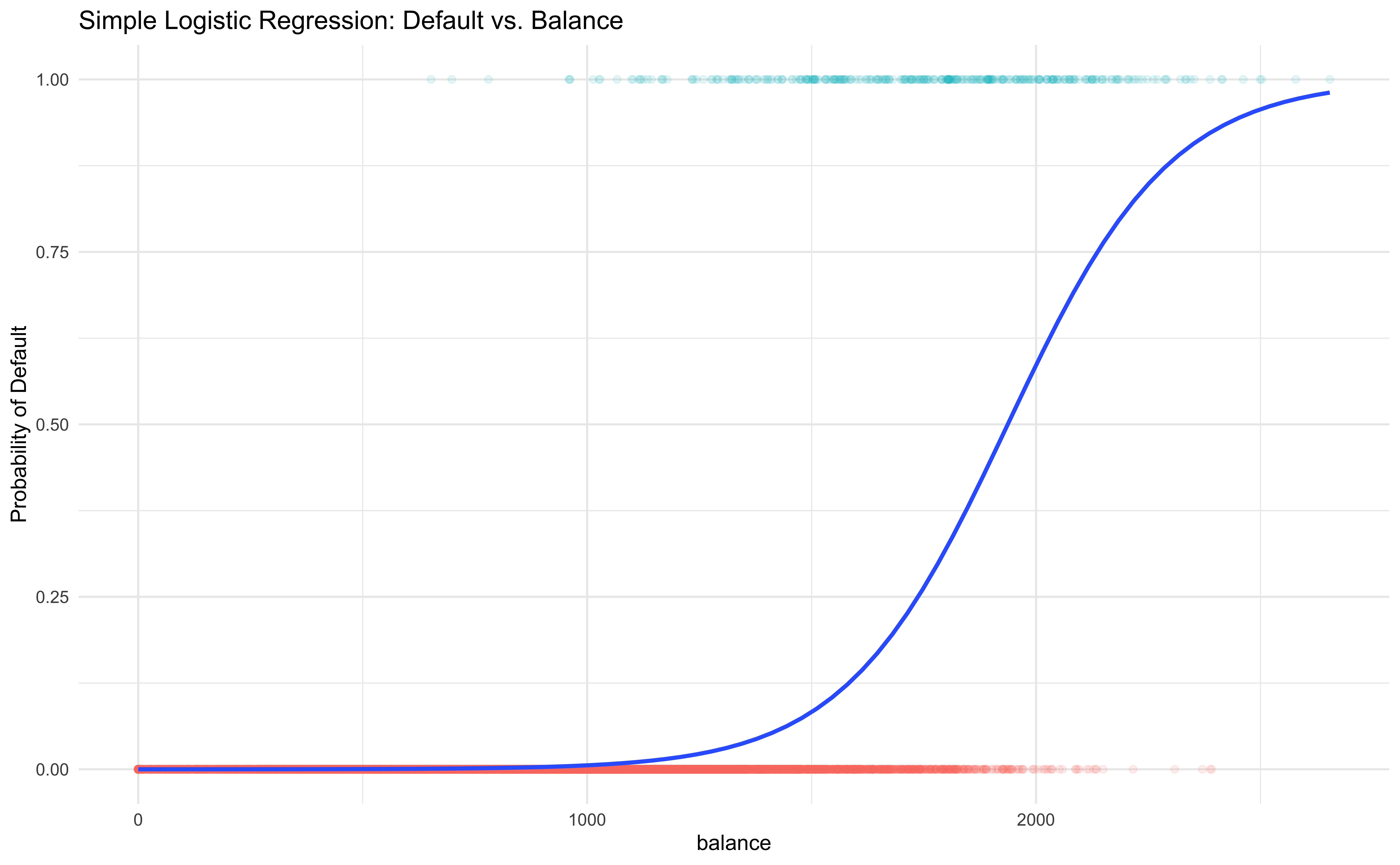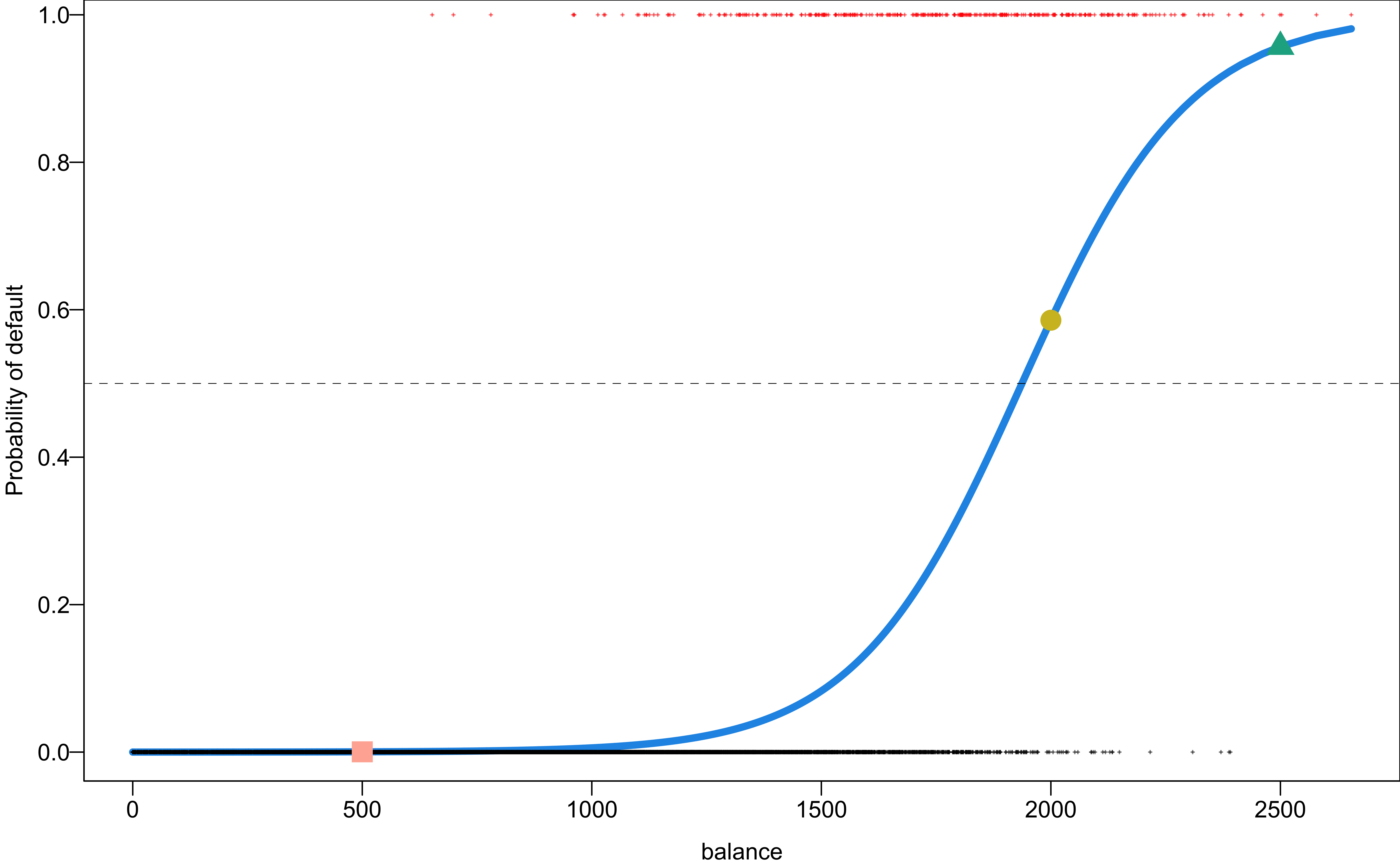balance increases the log odds of default by 0.005 units.default increases by 0.5% with additional one unit of credit card balance.\[\log\left(\frac{\hat{\pi}}{1-\hat{\pi}}\right) = -10.65+0.0055\times 2000\]
