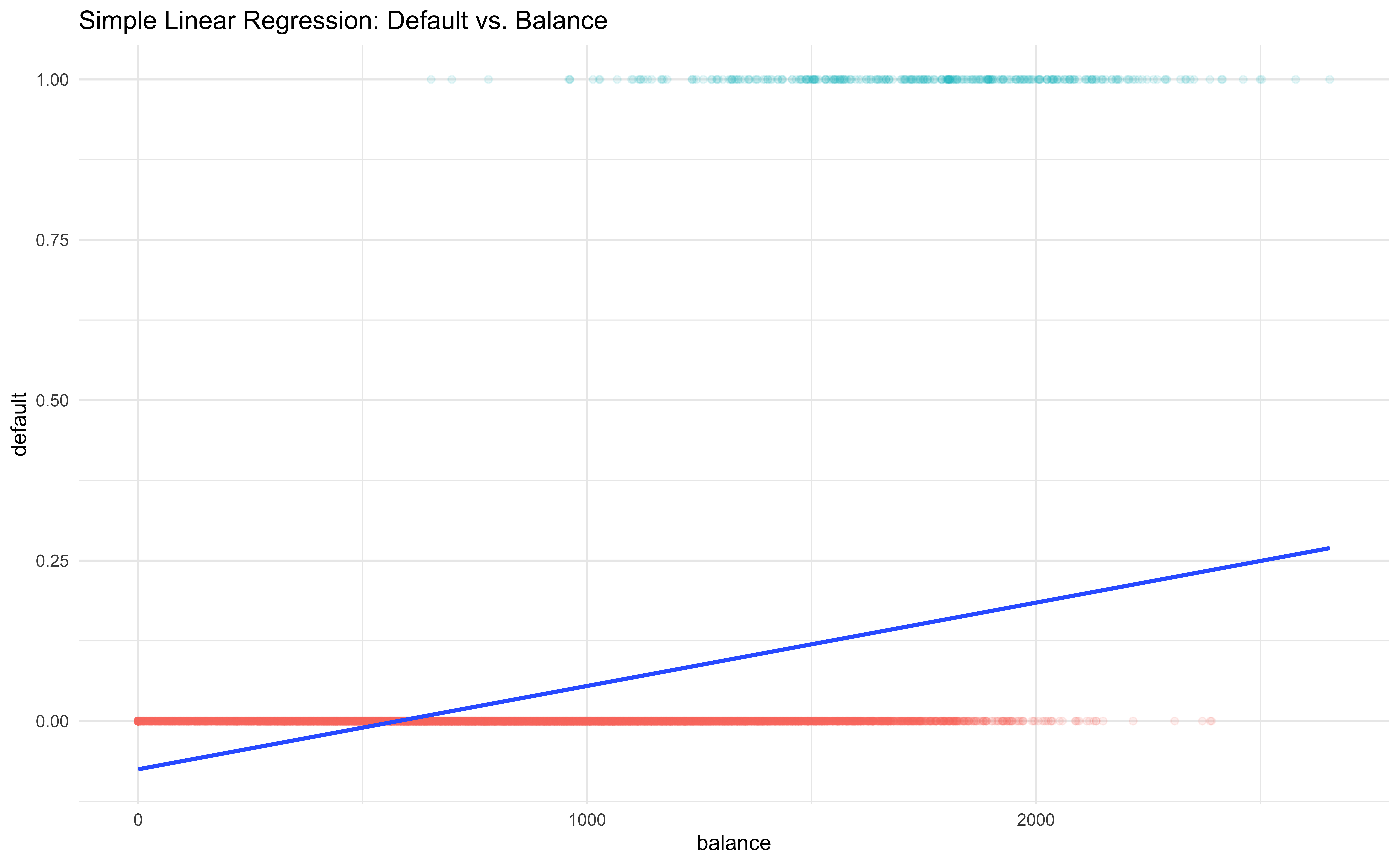\(\hat{Y} = b_0 + b_1X\) estimates \(P(Y = 1 \mid X) = P(default = yes \mid balance)\), which is equivalent to linear discriminant analysis (LDA) discussed later.