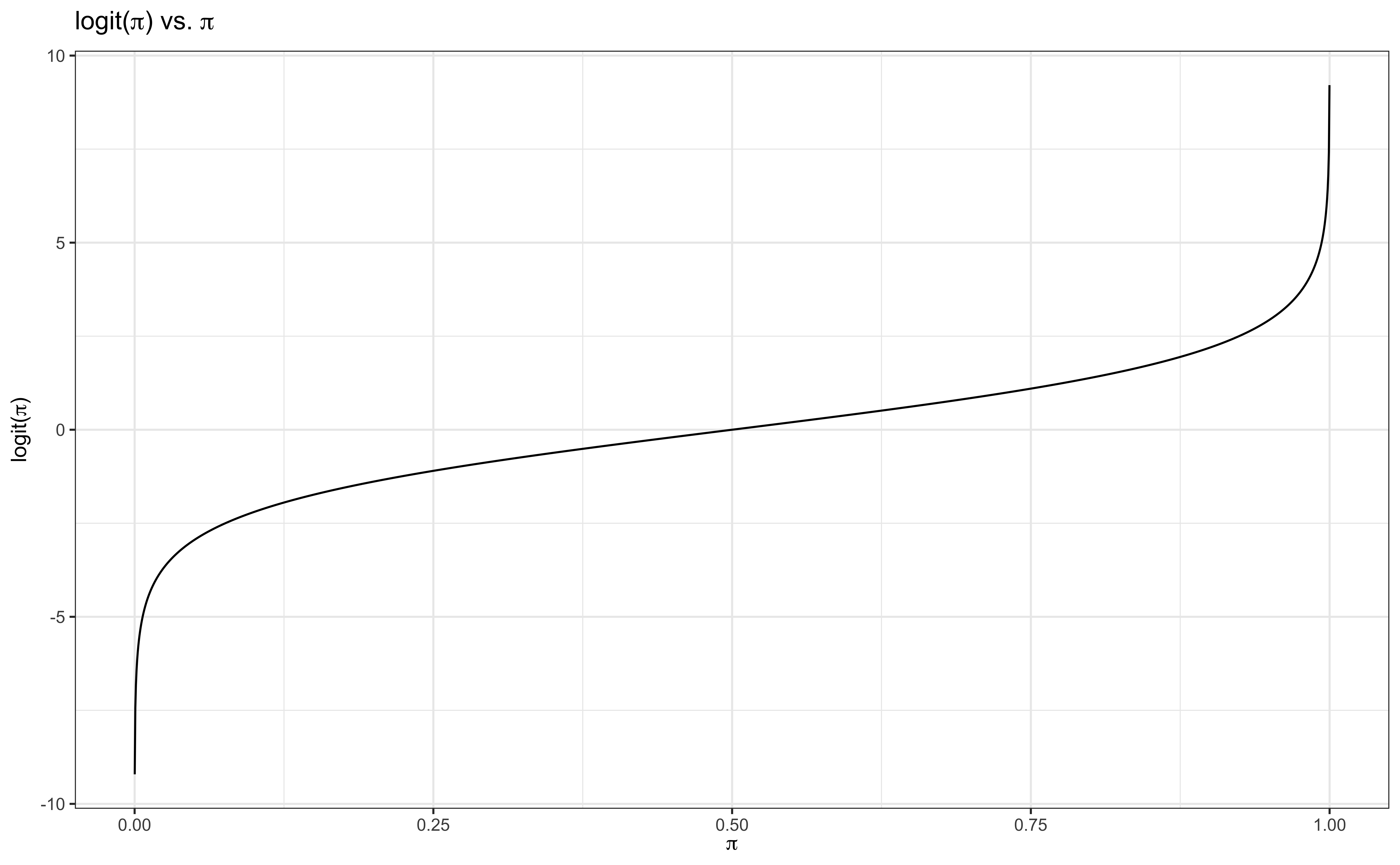 \[\eta = \text{logit}(\pi) = \ln\left(\frac{\pi}{1-\pi}\right)\]