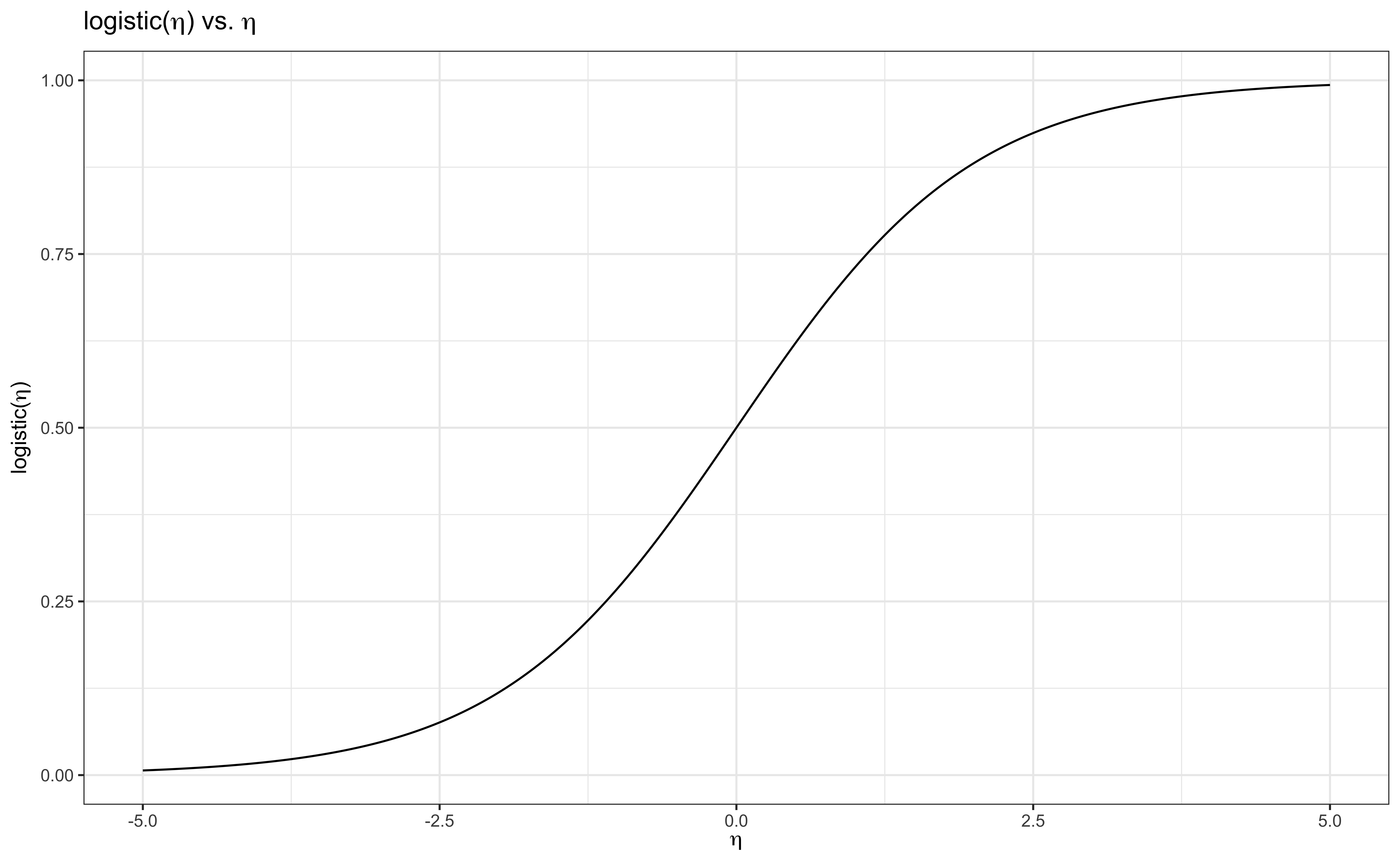 \(\pi = \dfrac{1}{1 + e^{-\eta}} \in (0, 1)\) is the CDF of the logistic distribution, whose PDF is of the from \[f(\eta) = \frac{e^{-\eta}}{(1 + e^{-\eta})^2}, \quad \eta \in(-\infty, \infty)\]