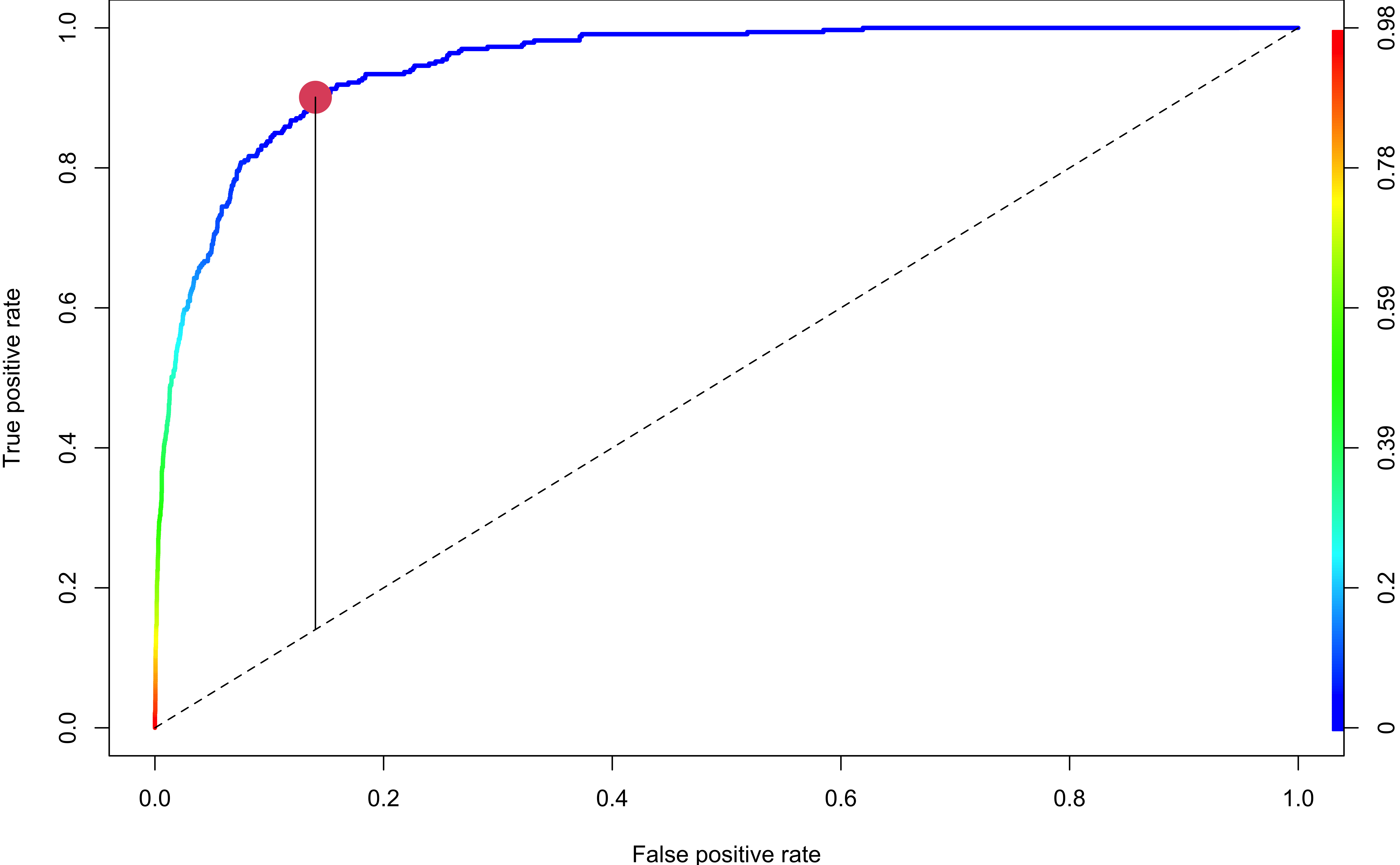 Youden’s J index \(= \text{TPR} + \text{TNR} - 1\) (the distance to the 45 degree identity line)