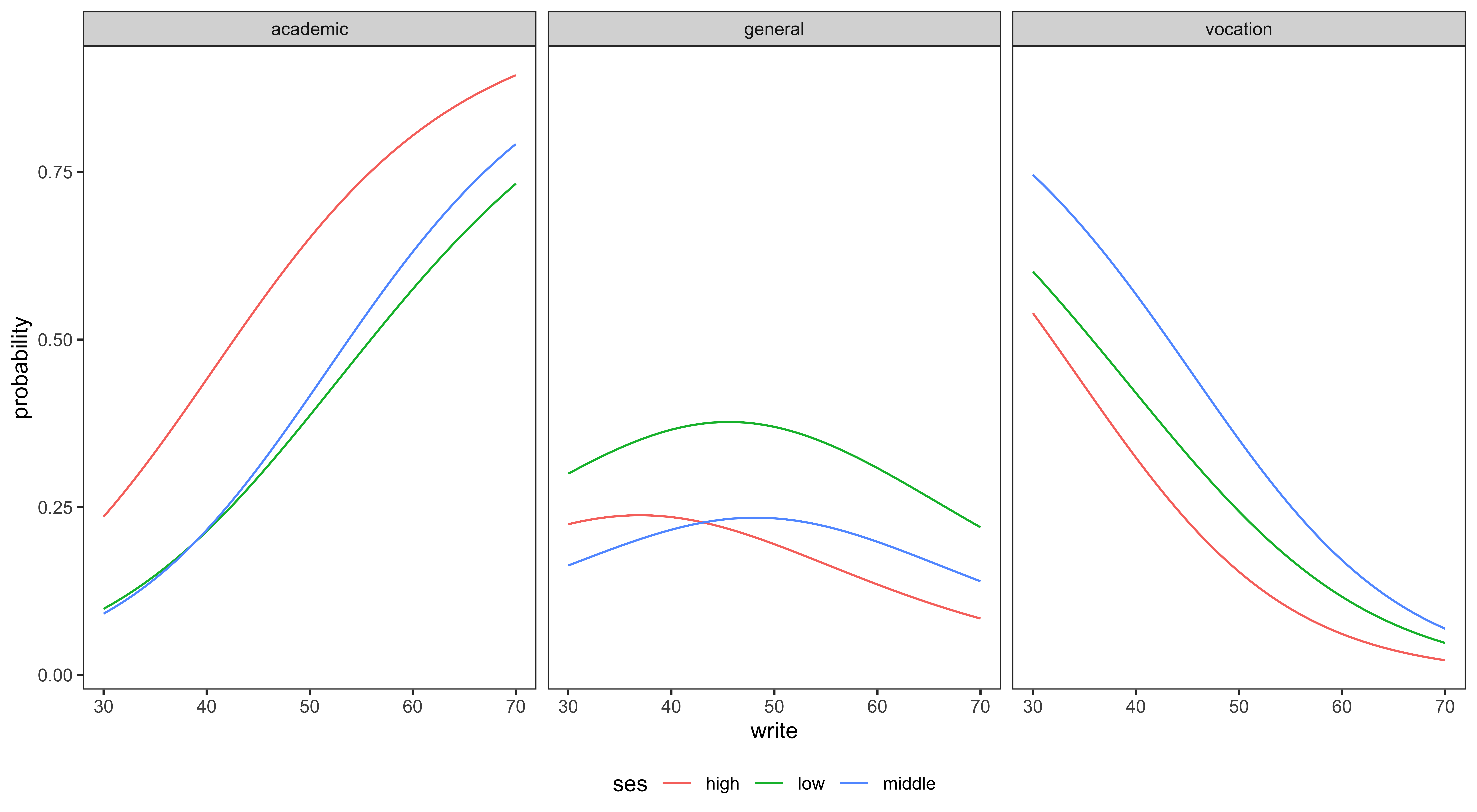 academic = 1, general = 2, vocation = 3)ses, low = 1, middle = 2, high = 3\[\log \left( \frac{Pr(prog = general)}{Pr(prog = academic)}\right) = b_{10} + b_{11}(ses = 2) + b_{12}(ses = 3) + b_{13}write\]