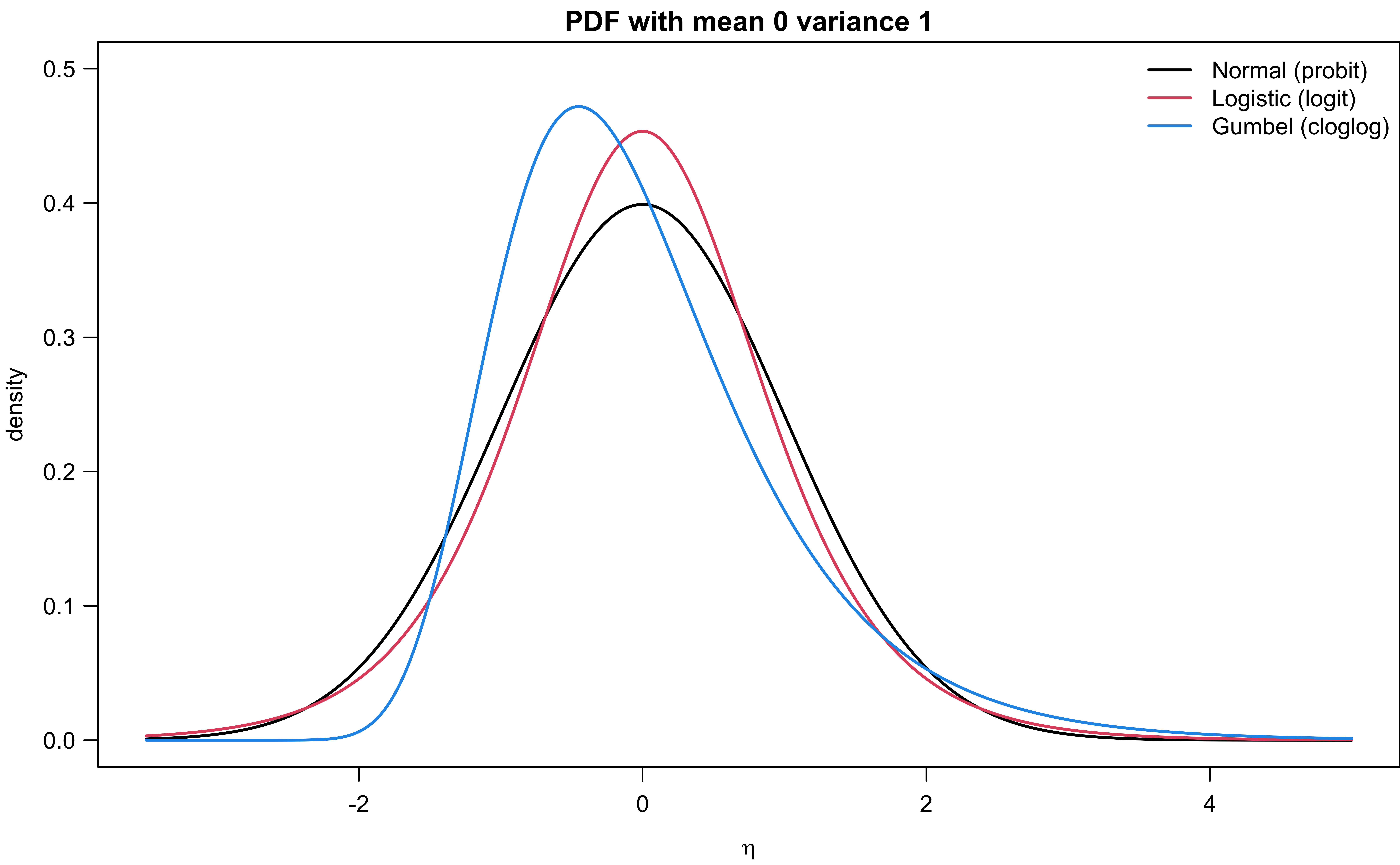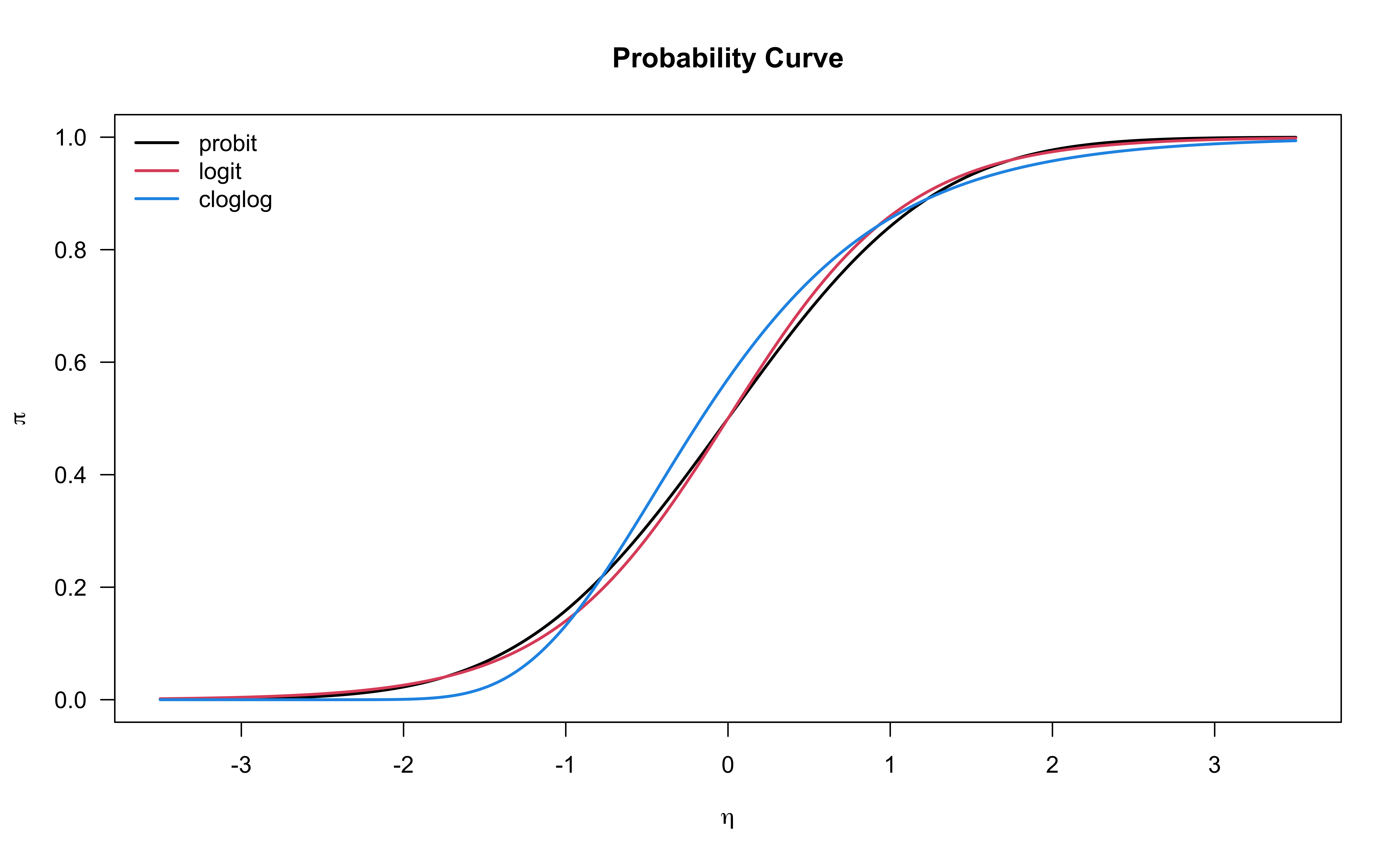 | Gumbel | cloglog: \(\log\left( -\log(1-\pi)\right)\) | \(1 - \exp(-\exp(\eta))\) | \(e^{-(\eta + e ^ {-\eta})}\) |