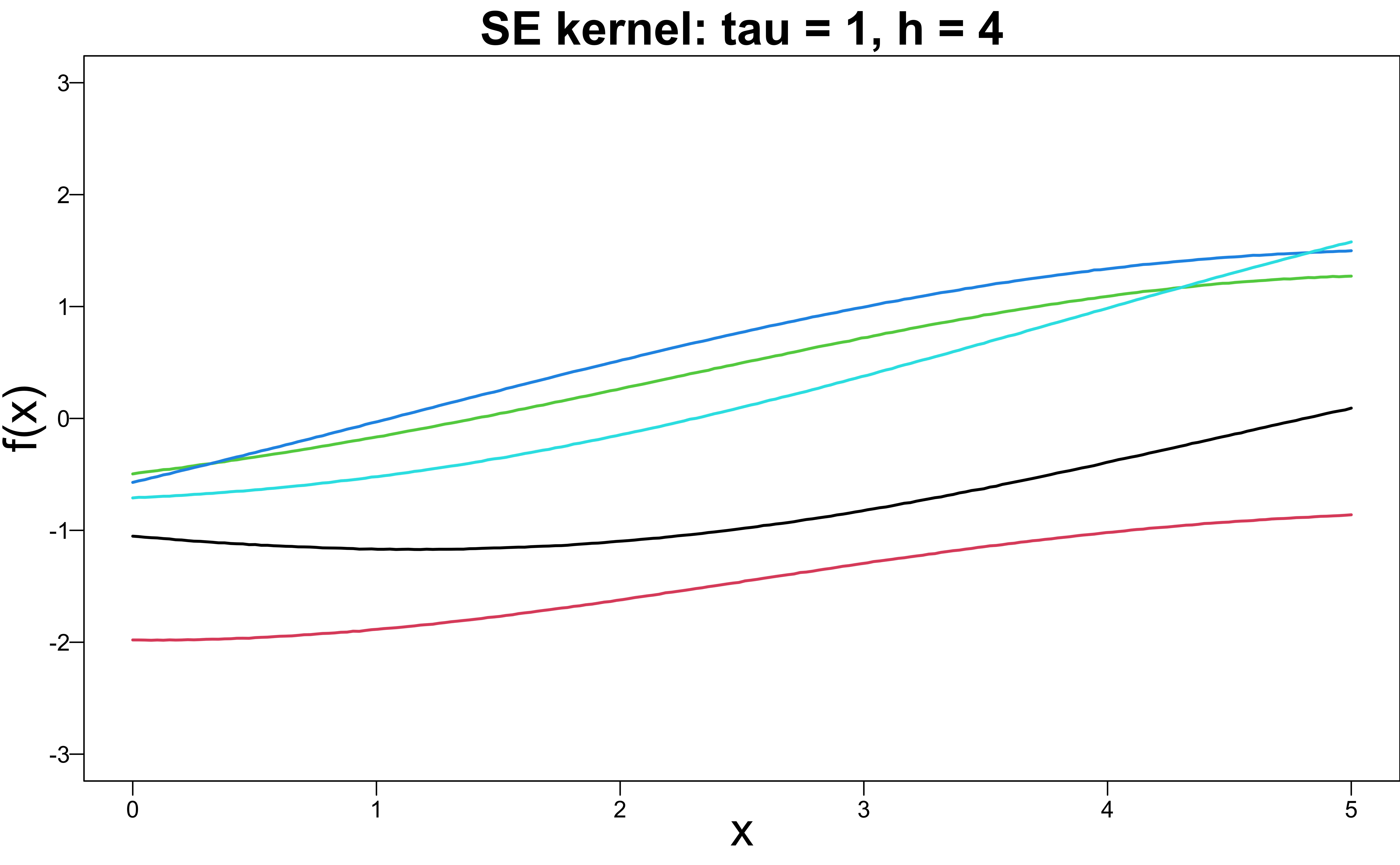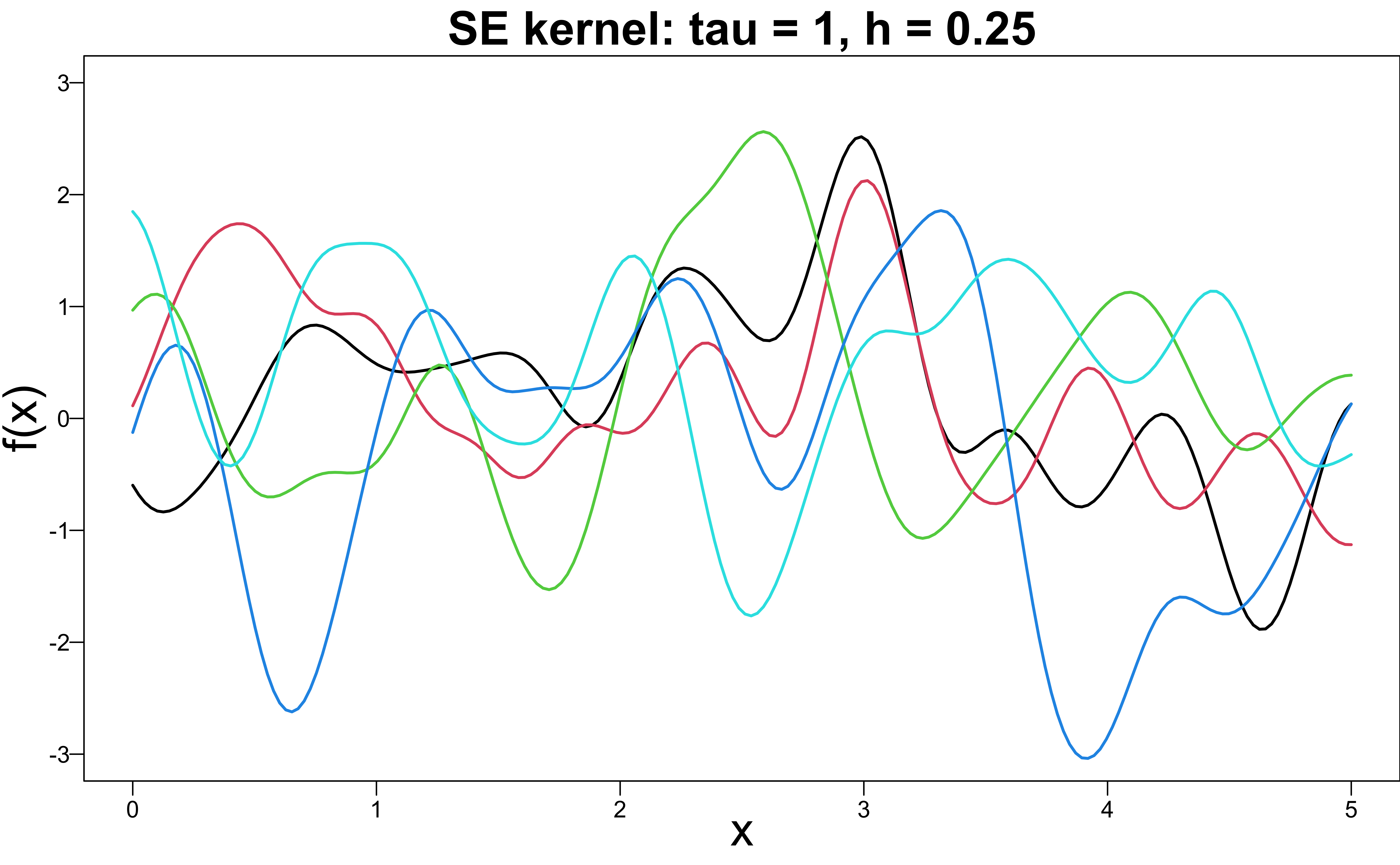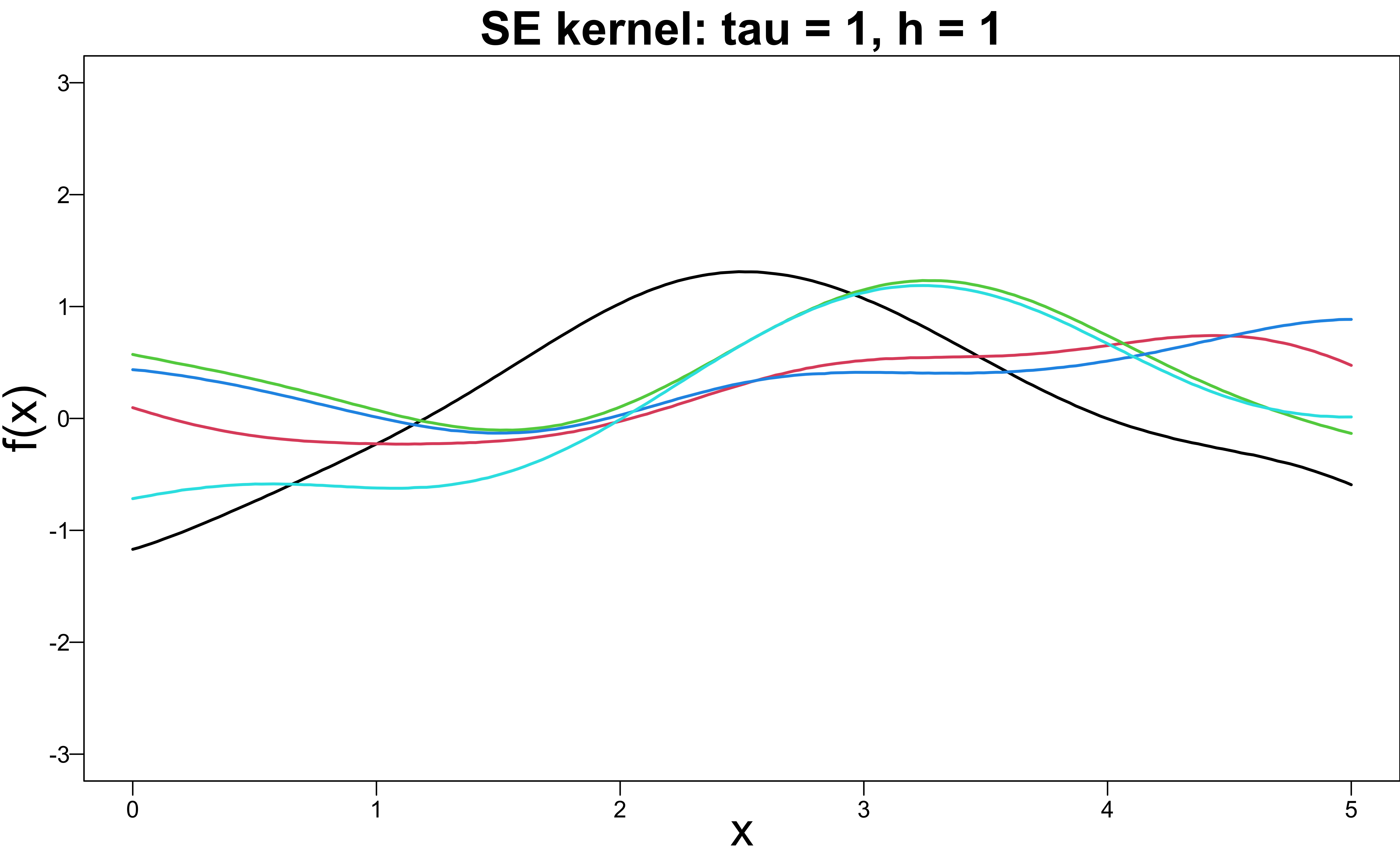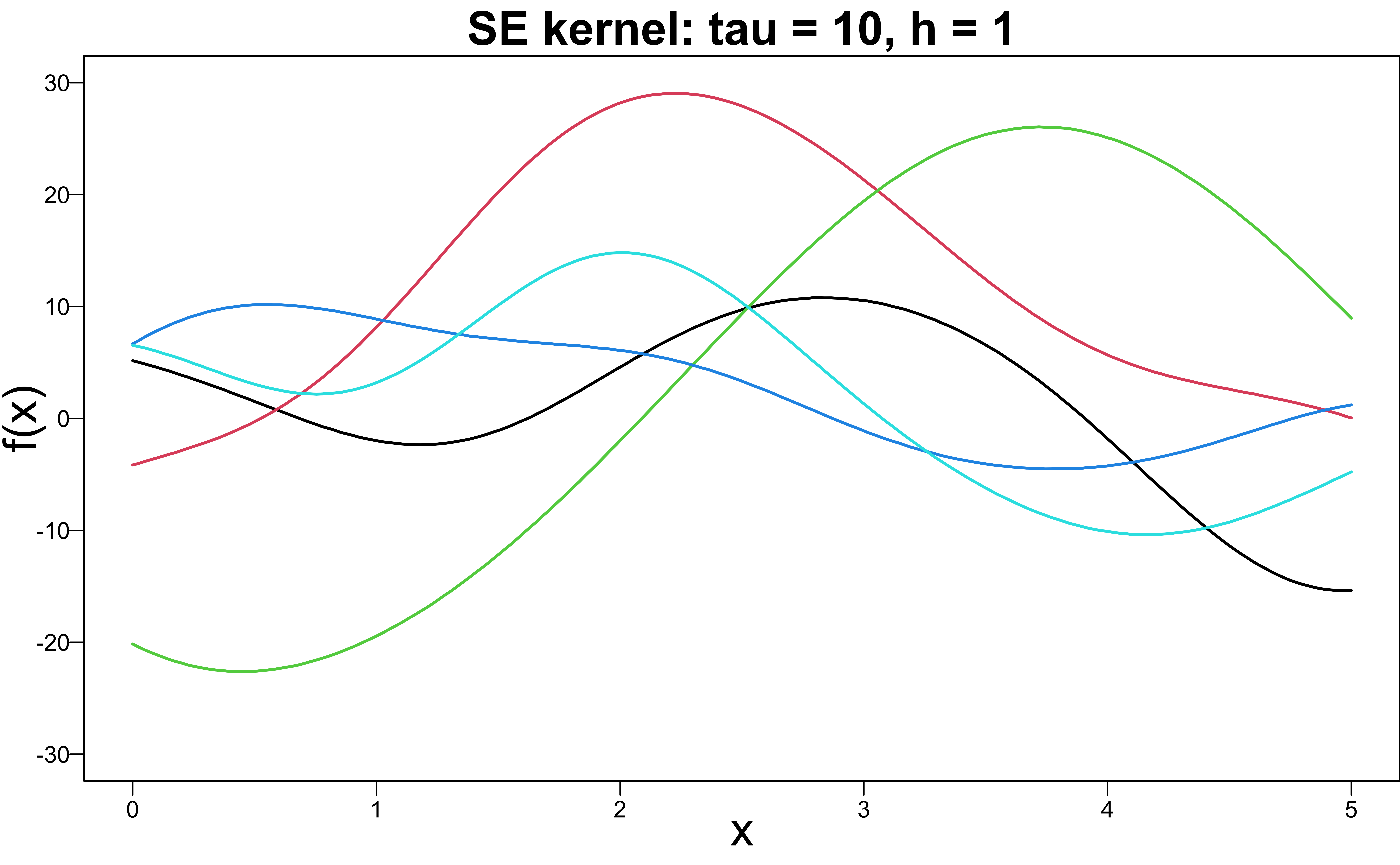 \[k(x, x' \mid \tau, h) = \tau^2 \exp\left(-\frac{(x - x')^2}{2h^2} \right)\]
