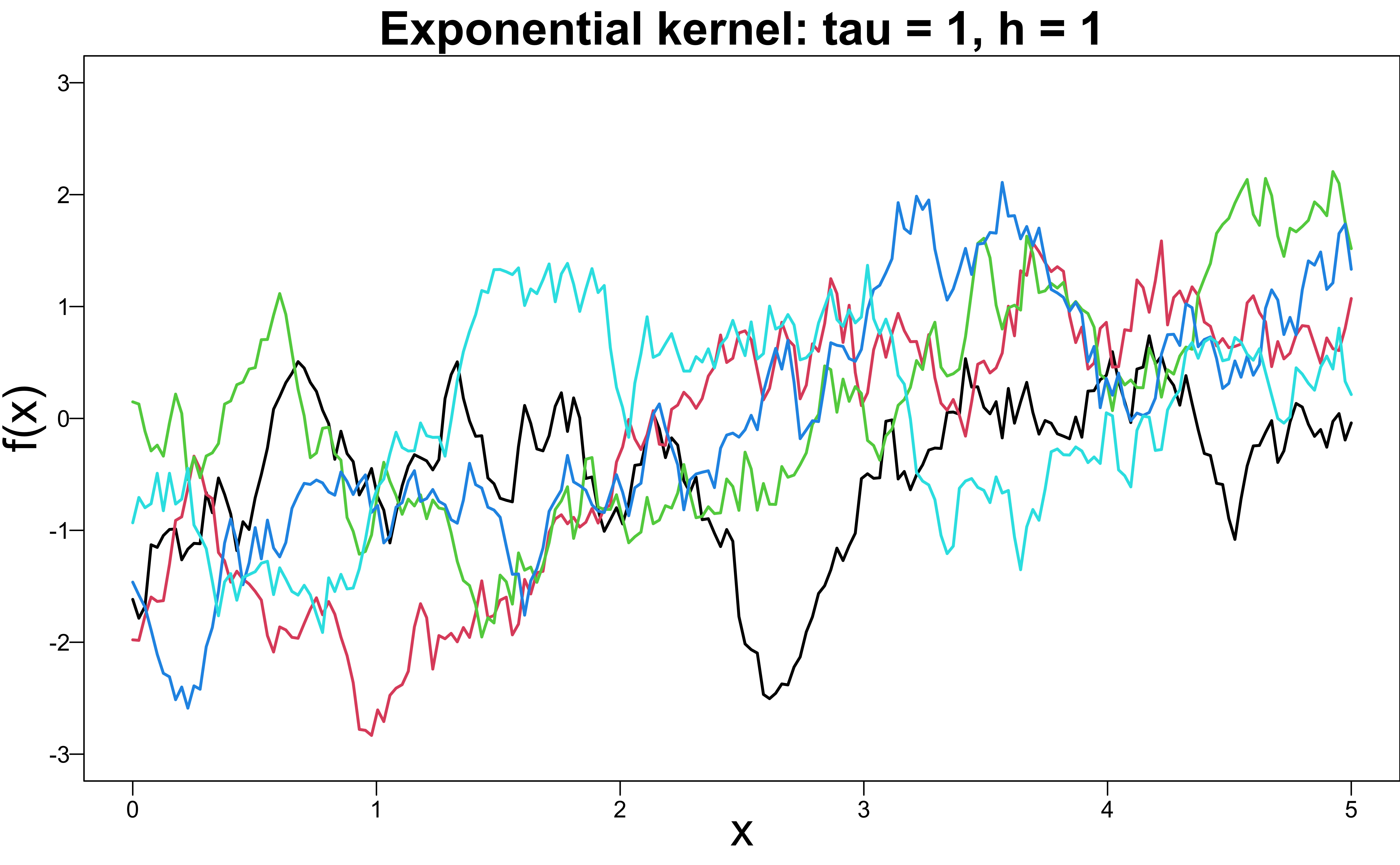 \[k(x, x' \mid \tau, h) = \tau^2 \exp\left(-\frac{|x - x'|}{h} \right)\]