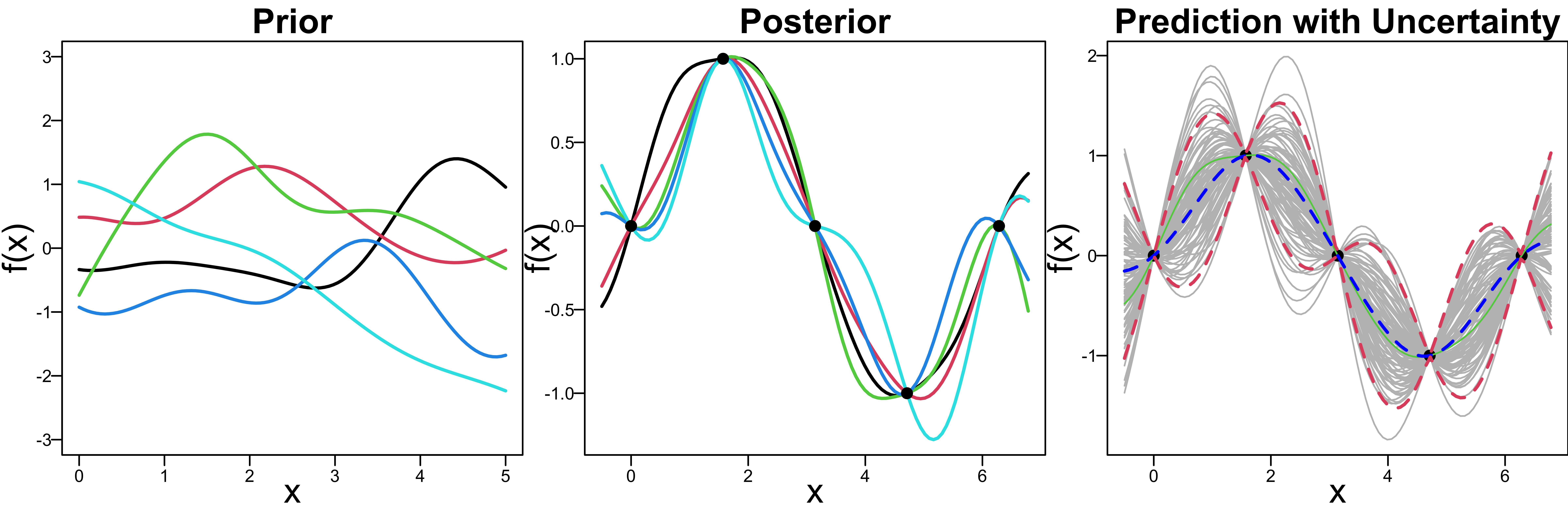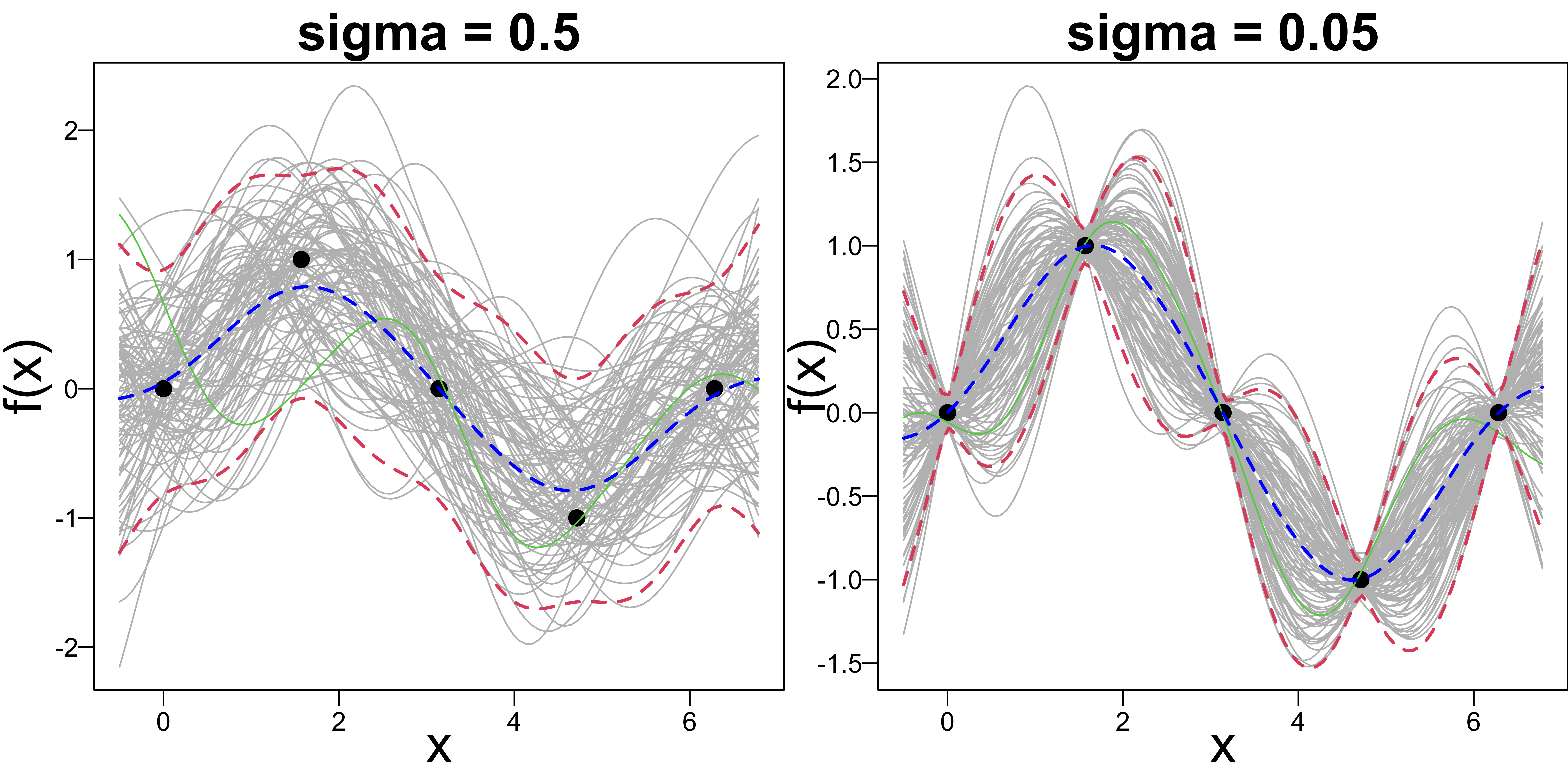 \[f(x^*) \mid y_1, \dots, y_n \sim N\left( \boldsymbol \mu^*, \boldsymbol \Sigma^*\right), \quad \boldsymbol \mu^* = K_{*}^T{\color{red}{(K + \sigma^2I)^{-1}}}{\bf y}, \quad \boldsymbol \Sigma^* = K_{**} - K_{*}^T{\color{red}{(K + \sigma^2I)^{-1}}}K_{*}\] with \({\bf y} = \left(y_1, \dots, y_n\right)^T\)