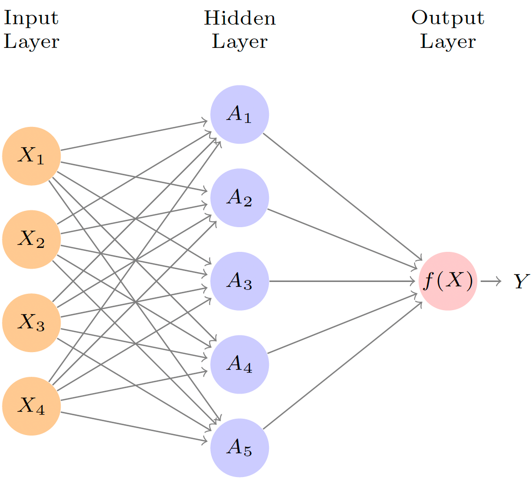 A neural network takes an input vector of \(p\) variables \(X = (X_1, X_2, \dots, X_p)\) and builds a nonlinear function \(f(X)\) to predict the response \(Y\).